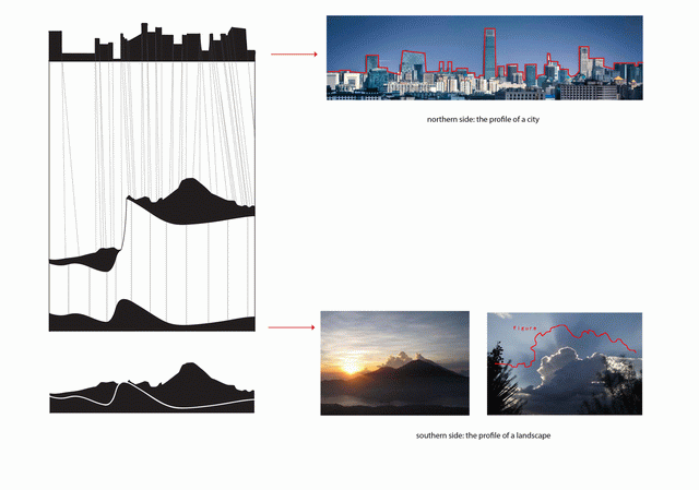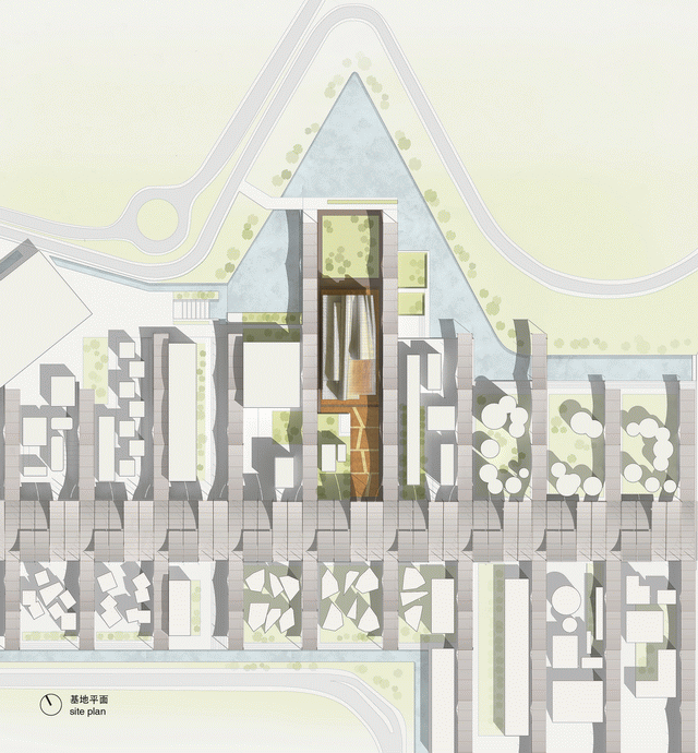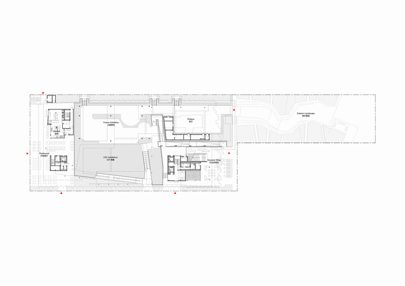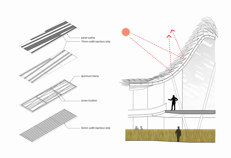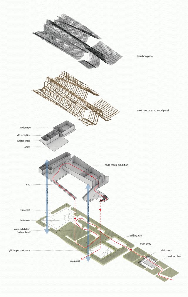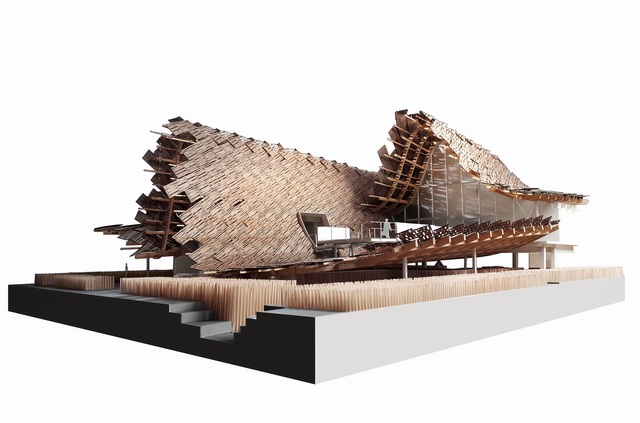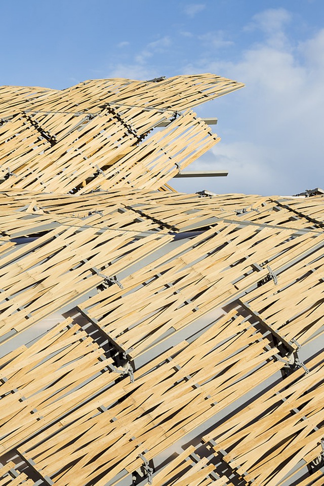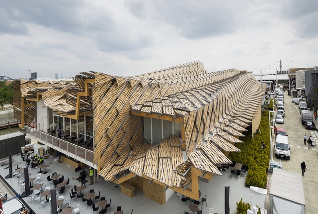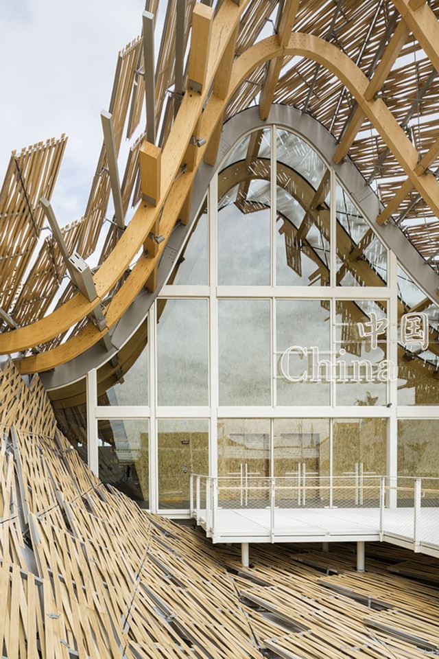 米兰世博会中国馆的主建筑正立面,是整个建筑流线最高潮的部分——高耸的胶合木结构屋架,宛如“群山”造型。中国馆的建筑外形提取了传统歇山式屋顶的造型元素,从空中看,如同希望田野上的一片“麦浪”;从正面看,如同自然山水的天际线;从背面看,又象是城市的天际线。设计师以满腔激情,向中国传统的抬梁式木构架屋顶致敬,也为观众提供了可以纪念留影的巨大空间。