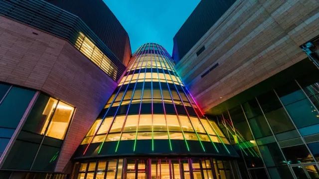 位于东南广场入口的充满设计感的锥形入口阶梯式玻璃幕墙,层层退台,宛若一个“彩虹冰淇淋甜筒”。