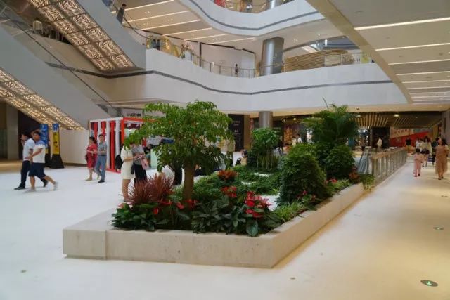 购物内部休憩平台,通过水池及绿化景观小品的应用,提高购物中心观赏度及舒适度。