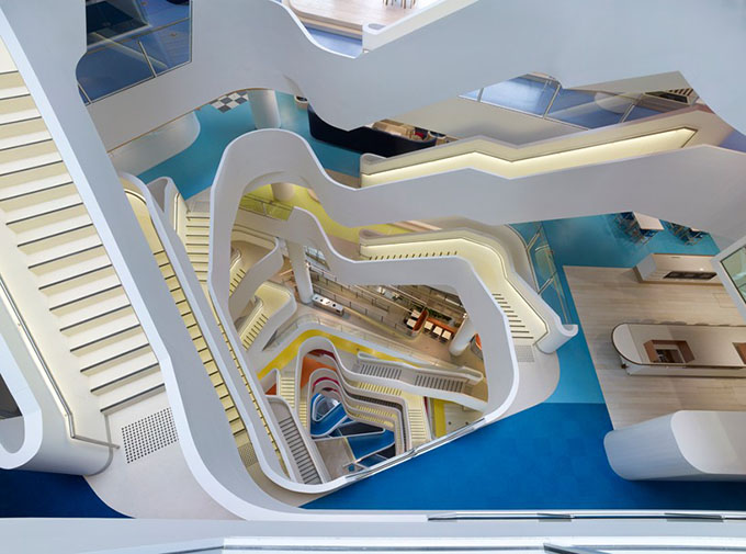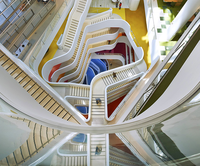 我们看到的满眼的错综复杂的楼梯从一般的观点看来的确非常震撼,很酷。通常我们会很关注我们要到达的地点,而往往忽略到达过程所处的空间。而这个特殊处理的楼梯则成为这里空间的焦点,几乎从任何地点都可以“感受”到它的存在,达到不被忽略的目的。曲线形的线条以及丰富的分层色彩让空间充满活力,让人有想要去“走”它的冲动。楼梯连接的每一层都直接面对自由开敞的办公区域,所以其使用相当便捷,从而创造出一个强调运动、灵活、自由、互动的办公空间。