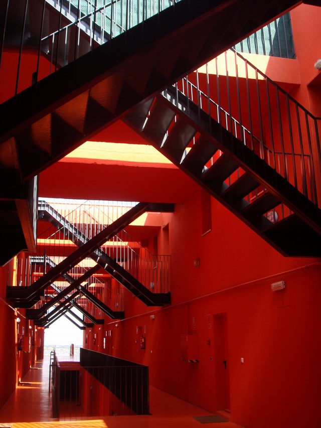 楼梯是此建筑最主要的交通节点,贯穿建筑的半室外通道,显眼地暴露在立面上,作为对平面街区室外街道的垂直对应:一方面连接了两侧的体块(建筑),另一方面也将它们与室外街道(城市道路)以及中央的平台(内院)串联起来,使体块(建筑)群形成一个向心的整体;同时,它赤裸的立面也以一种强烈的色彩对比清晰地分割了两侧建筑体块肌理。