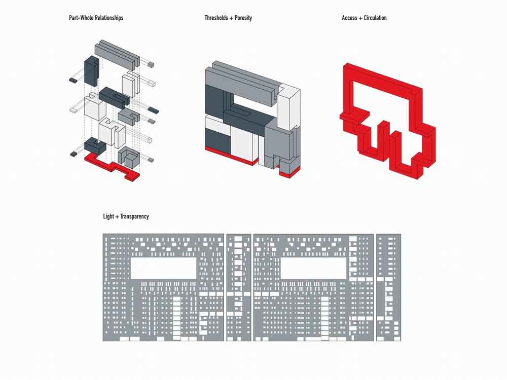 在这个“超级街区”内,建筑内部空间公共性的强弱也就通过立面上开敞性的大小得到反应,形成虚实对比;另外,半室外的公共空间向建筑内部引入了大量光线,超越了传统平面街区狭长灰暗的街道体验。(文字来自网络)