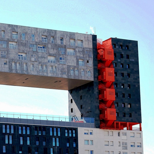 整幢建筑最显眼的部位即是亮橙色的带状交通走廊,它连续地将9个建筑体块包裹起来形成一个整体,并结束于位于13层的公共平台,橙色带和平台共同组成了建筑的交通空间,这可以看做是将平面街区单幢建筑之间通往内院的道路翻转后形成的三维表现,因此这套系统也称为“空中街道”。产生了楼梯–走廊–平台–街道的垂直交通顺序,串联起一个垂直方向的社区。