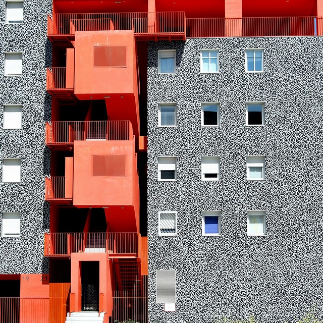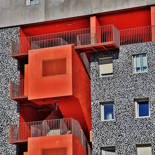 不同建筑体块的堆叠成就了建筑内部空间的多样性,与之对应,建筑师在平面上用了不同的材质和色彩来表达。混凝土、石块和马赛克分别组成的由浅至深三种不同灰度对比强烈的基调,加上交通空间鲜明亮橙色,共同形成了建筑丰富的拼贴式外立面,这种混合和对比改变了原来城市街区一成不变的乏味的色调。