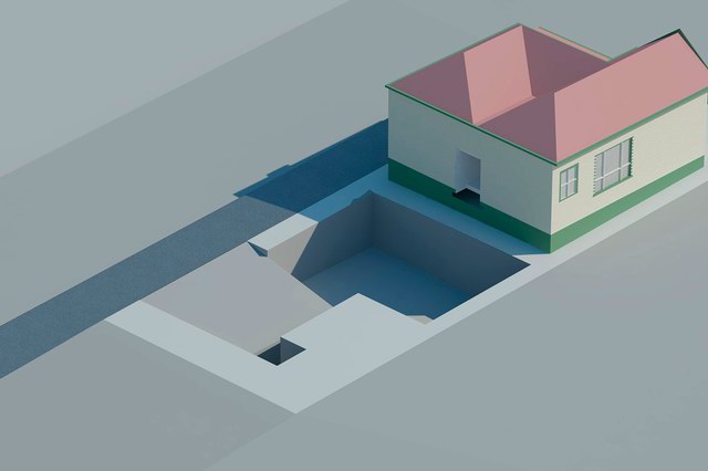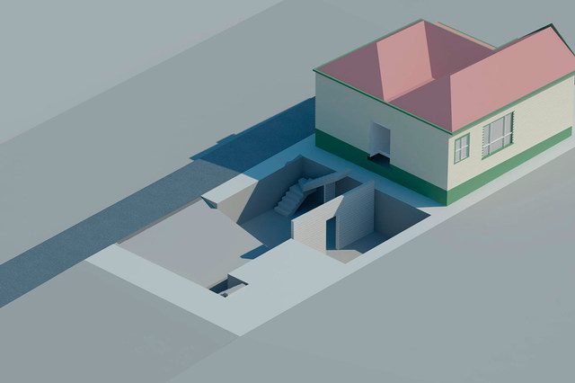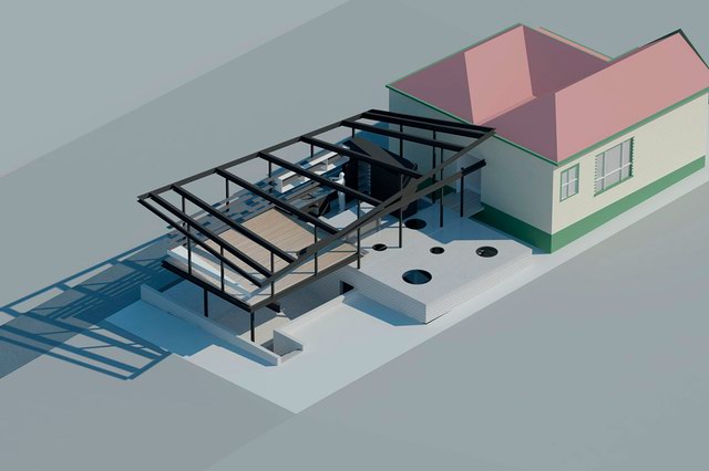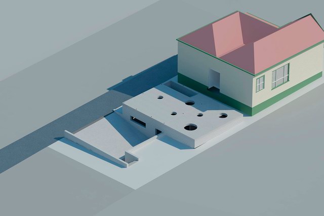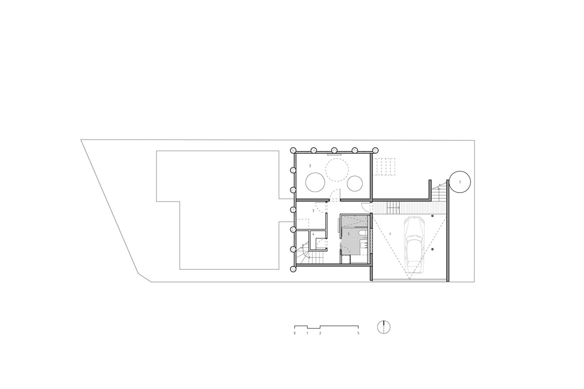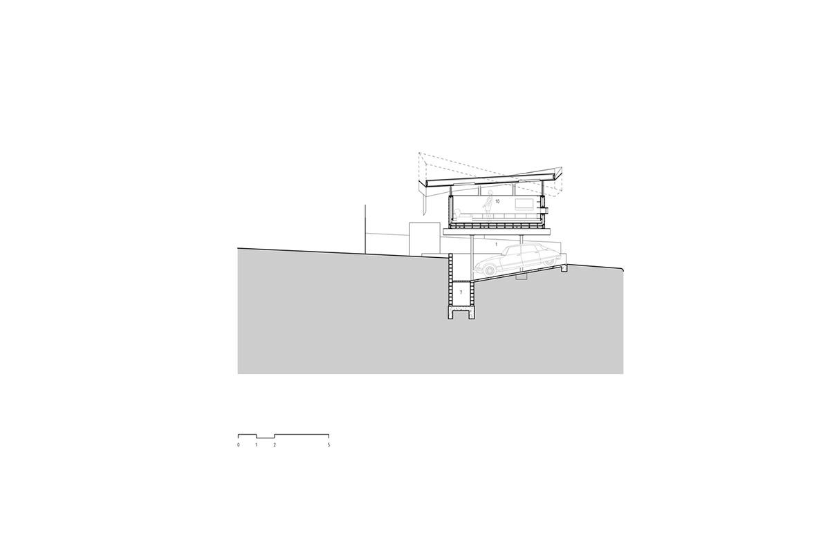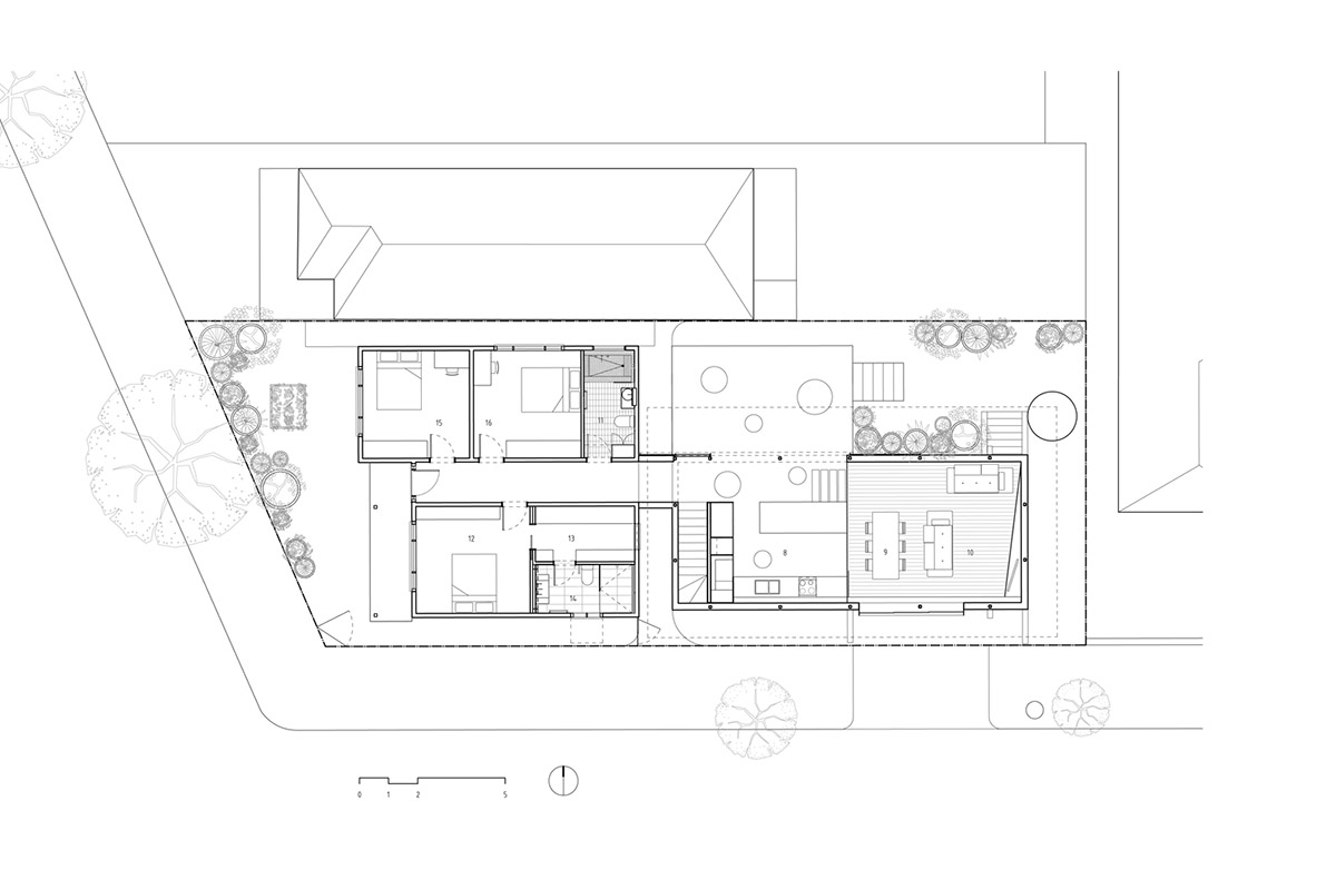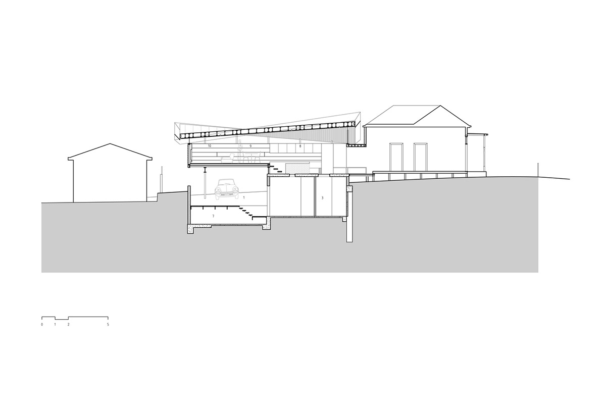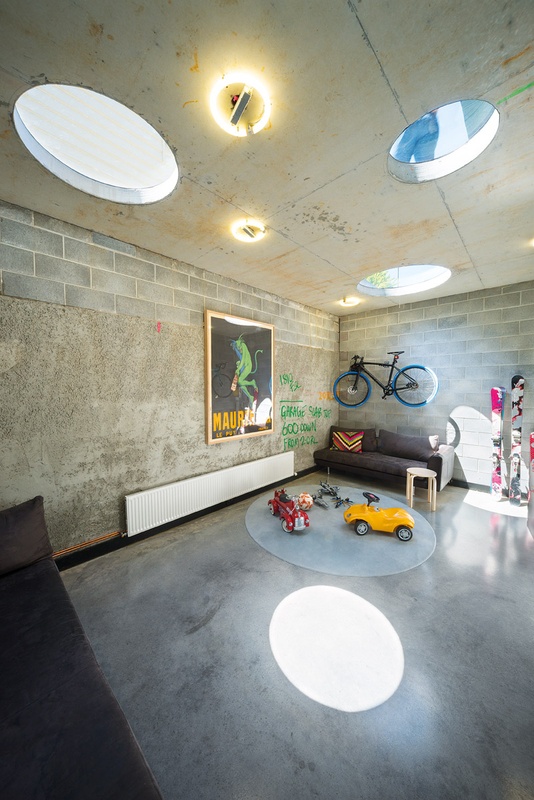 新建部分为两层,首层局部埋在地下,容纳了车库与活动室。有趣的是分割一层与二层的地板上开设了许多圆形的洞,并安装上钢化玻璃,使得地下与地上得以连通。二层翘起的屋顶让房间获得了更多的采光,轻盈而通透成为这座建筑的明显气质。
