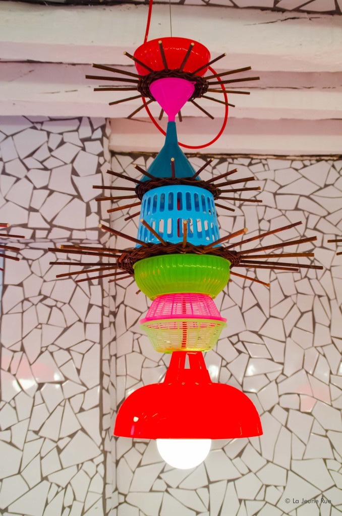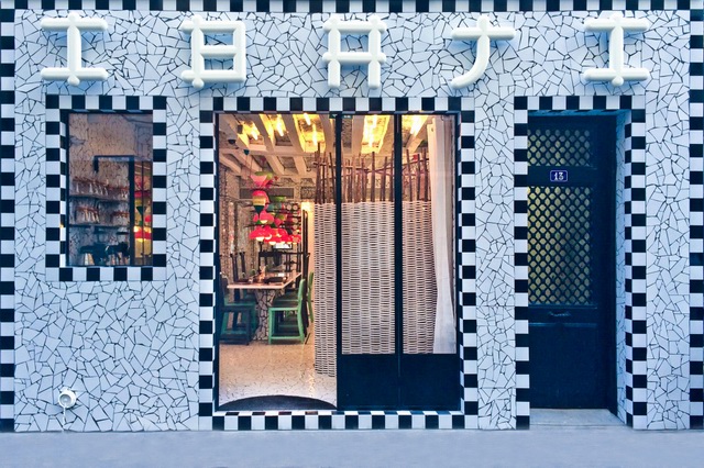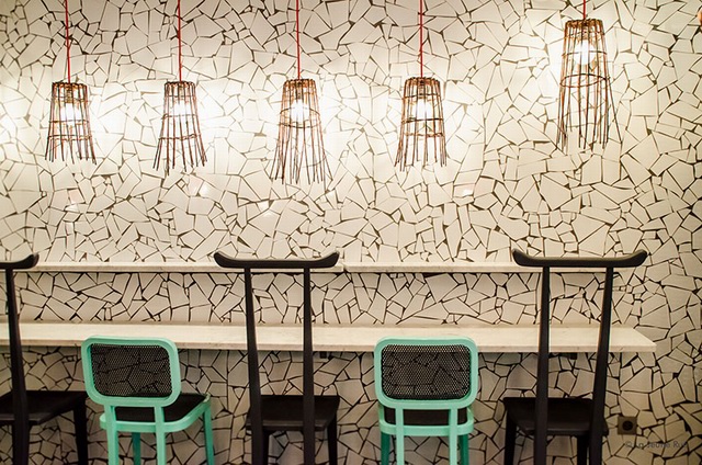 我们看到建筑内原有的屋顶木梁被保留,并刷成了白色。剩下的室内室外的墙面与天花板都被贴上了貌似自然裂纹的马赛克瓷砖,显得整体风格非常一致,给人以很深刻的印象。在加上色彩艳丽的吊灯后,马赛克反射出淡淡的色泽,显得很精致仔细。