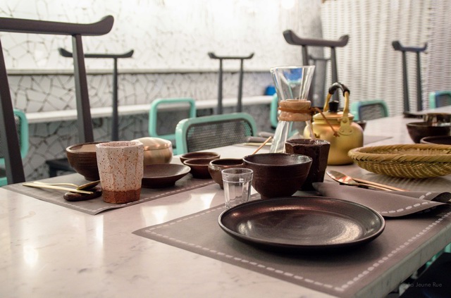 通长的桌子在狭窄的空间中显得更加适合有效,还能促进陌生人间的相互交谈。不仅如此,下至餐具的选择都与这种朴素却不是细节的设计风格相互靠近。