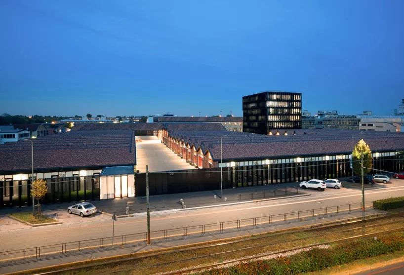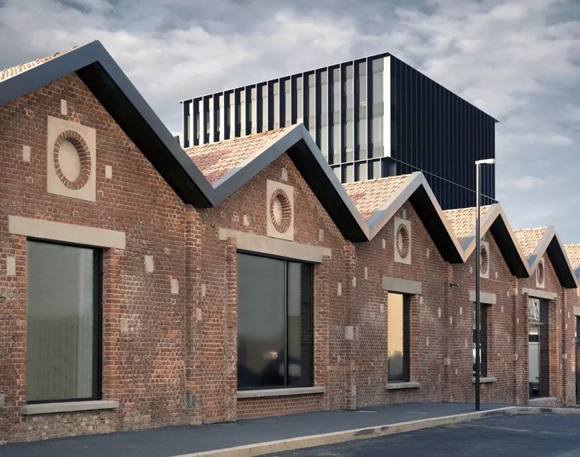 该项目将一座六层高的大楼与工业风的旧仓库合并,大楼与旧仓库建筑和谐相融。由玻璃立面环绕、覆盖规律遮阳板的新体量打破了这个场地的对称性。该建筑外侧覆盖了一片由深色金属制成的垂直构件,可以为室内遮挡阳光:这座高大的现代建筑与低矮仓库裸露的红砖形成了强烈的色彩对比。