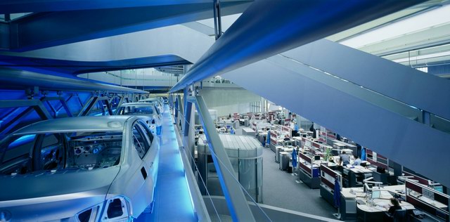 在办公室和精巧的开放餐厅上空,沐浴在缥渺蓝光中的半成品车身在生产线上缓缓移动。一旦它的移动速度慢了下来,技术人员就能察觉到工厂生产节奏的改变,可以很快找到问题所在。