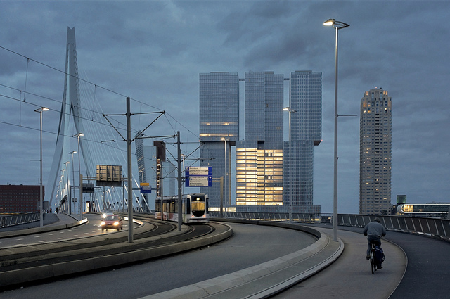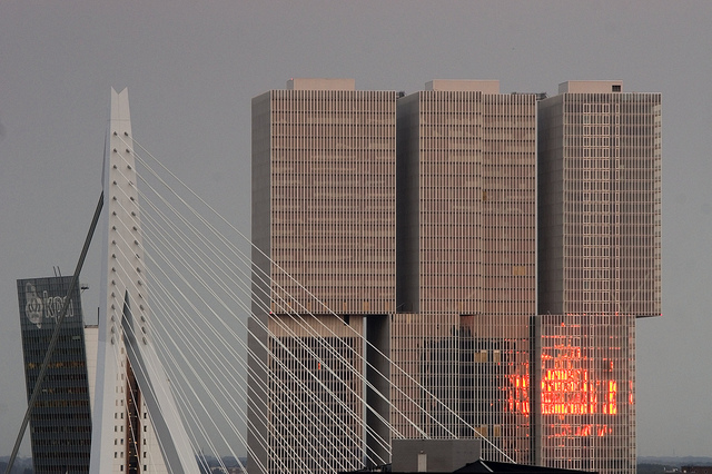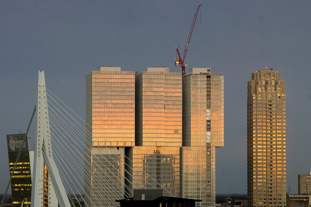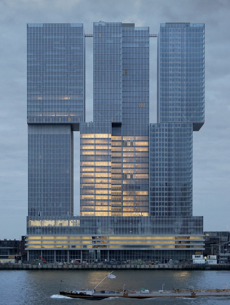库哈斯 和他的事务所O.M.A.设计的位于荷兰鹿特丹的De Rotterdam大楼是为开发商MAB和OVG地产公司设计的。De Rotterdam大楼将提供16万平方米的可用空间,成为荷兰同类建筑中最大的一座。在经济衰退之时,鹿特丹通过私营企业的力量开始建造这个预算为3.4亿欧元的工程,项目已于今年完工。