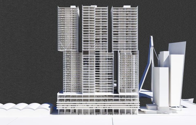 De Rotterdam大楼包括三座相互连接的混合用途大厦,高度为150米,容纳了办公室、公寓、饭店、会议室、体育馆、餐馆和咖啡馆等。鹿特丹的居民和办公室职员都可以利用饭店的健身设施、餐馆和会议室。办公室、饭店和公寓的大堂位于基座上,也为乘坐各种交通工具的人提供了一个交通枢纽。大厦是旧港区Wilhelminapier再开发的一部分,靠近Erasmus桥。