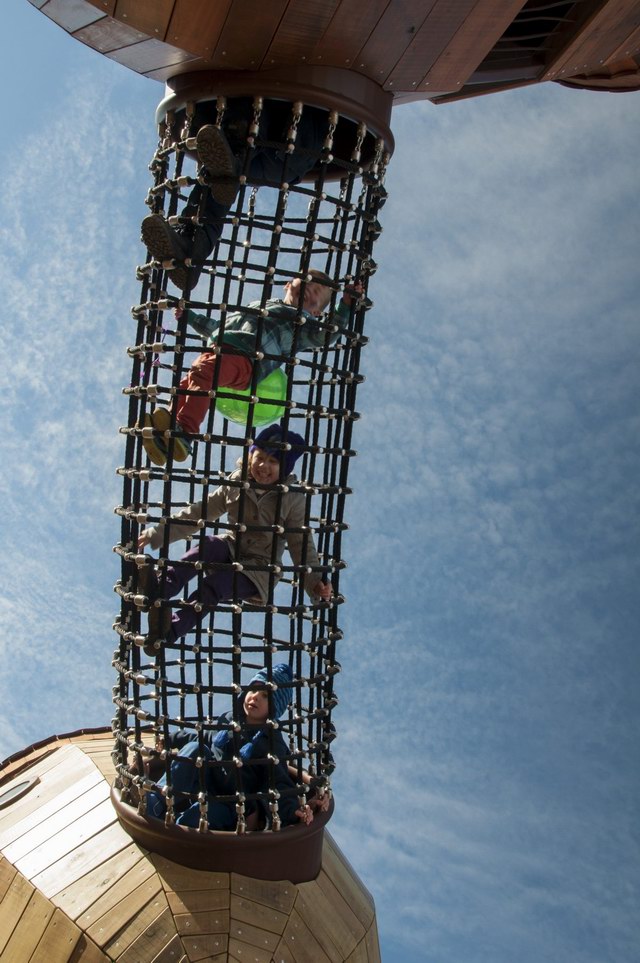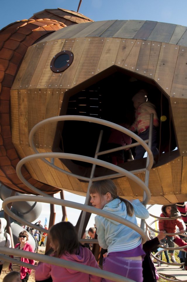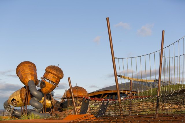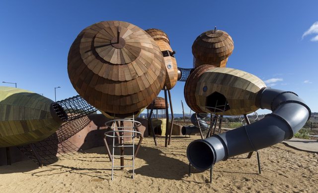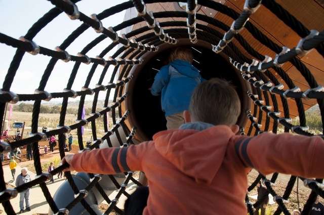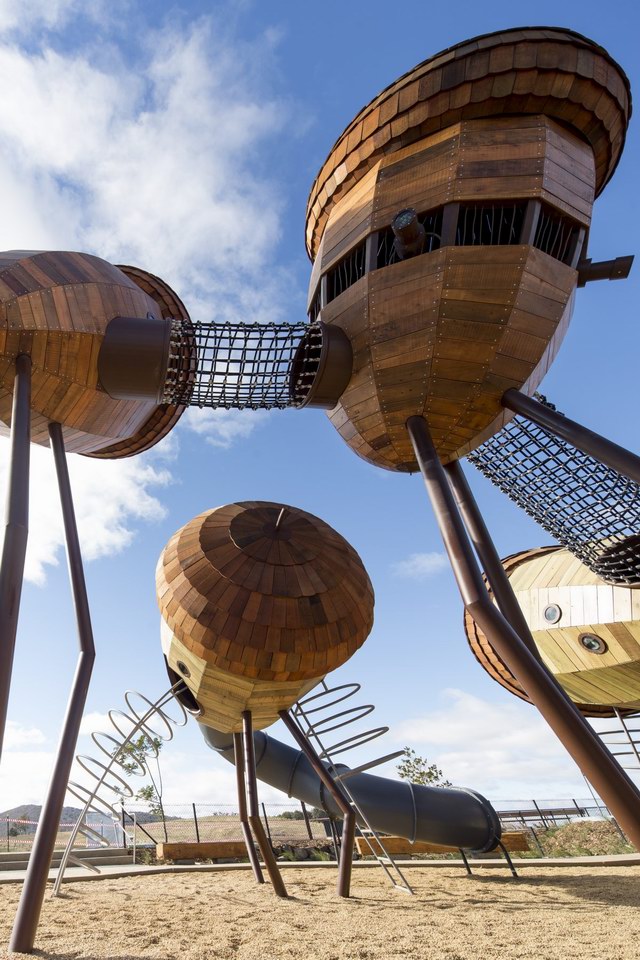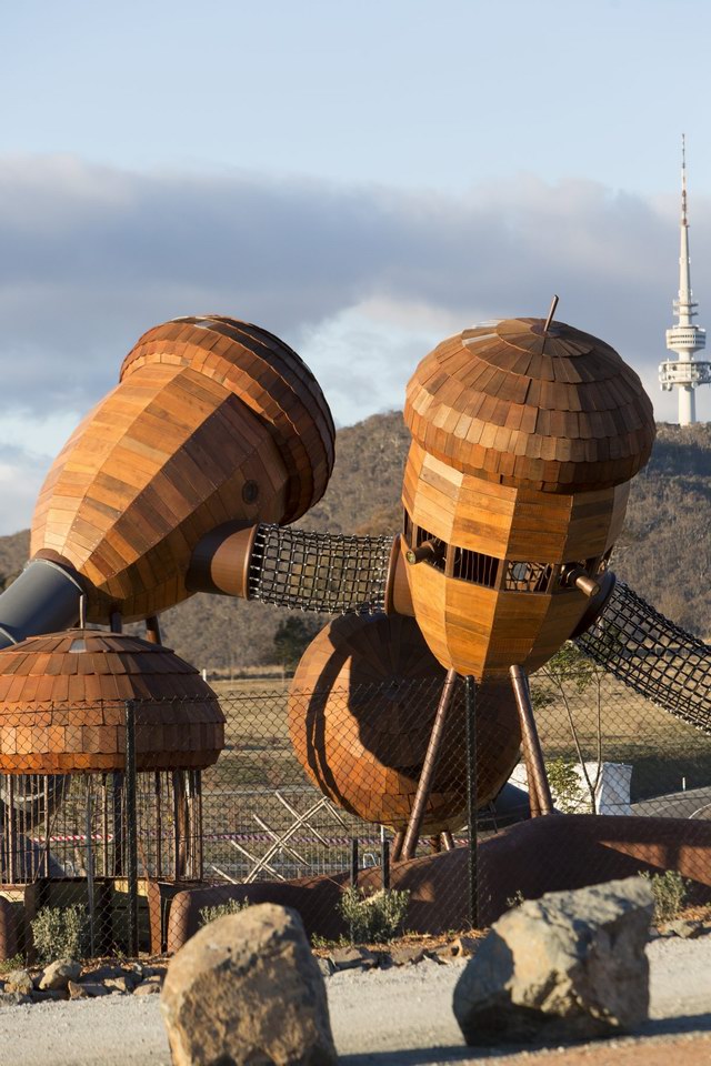 Taylor Cullity Lethlean将游乐场设计成了一个小型的主题公园,主题当然是围绕着植物进行。你可以看到巨大的橡子小屋被挂在天空,“橡子”之间有管道连接,孩子们可以从这颗“橡子”爬进那颗“橡子”。还有巨大的山龙眼(Banksia,澳洲著名的代表性植物之一)圆锥体坐落在森林地表。