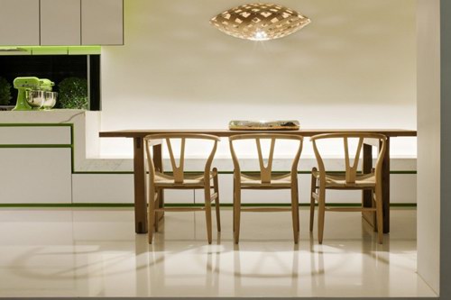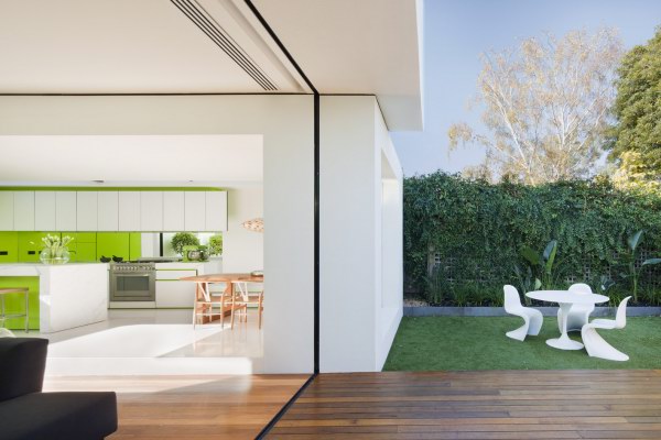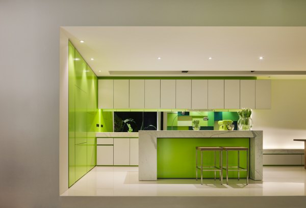 住宅的在后面由三个骰子似的方盒子组成,随机地落在一起,紧挨着曾经的维多利亚富豪的房子。建筑以白色为主,配以局部绿色的墙面和家具,为了增加室内空间的流动性和开敞感,家具的选用都很“轻盈”。沙金史蒂文斯住宅(Shakin Stevens House)是一座现代感十足的现代居室,空间如此干净,使得建筑就像一座完美的现代艺术品。