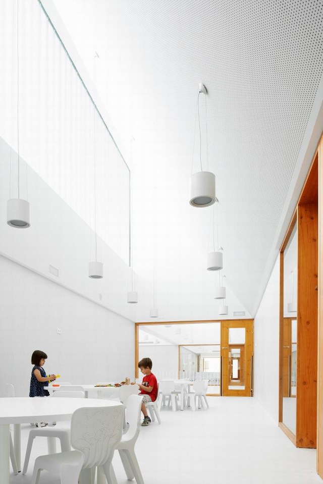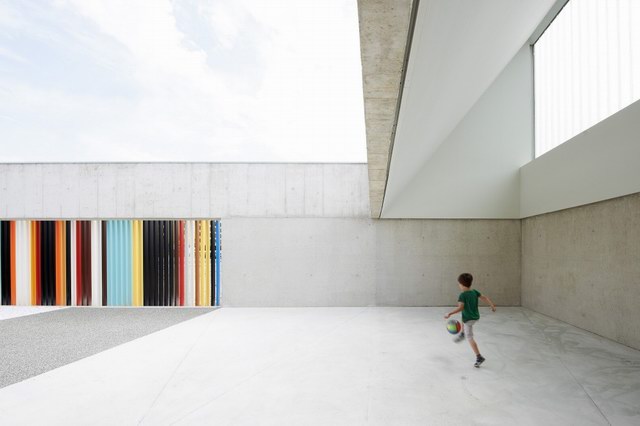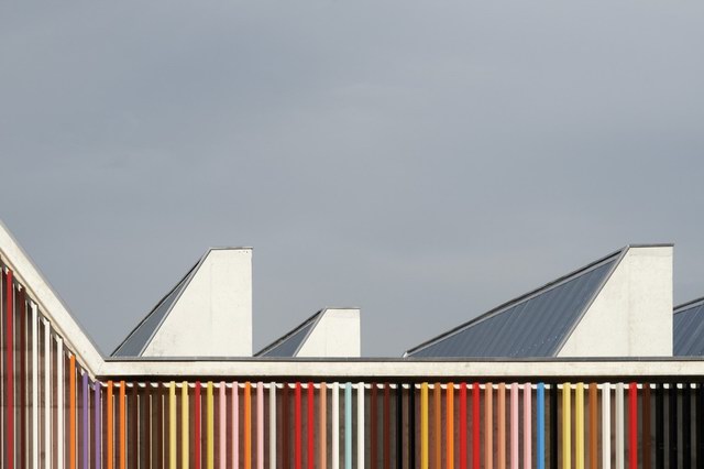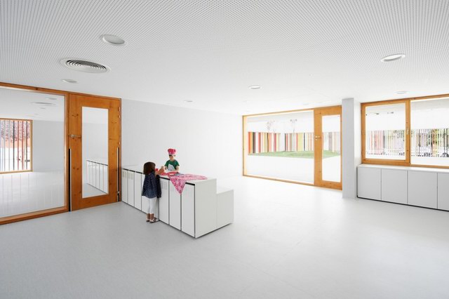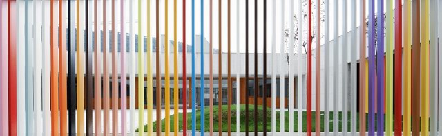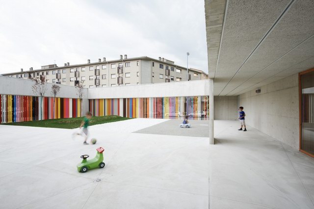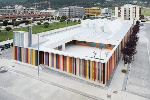 这所幼儿园位于西班牙潘普洛纳(Pamplona)附近,一排排多彩的百叶窗围绕在建筑四周,将教室与活动操场围在其中。