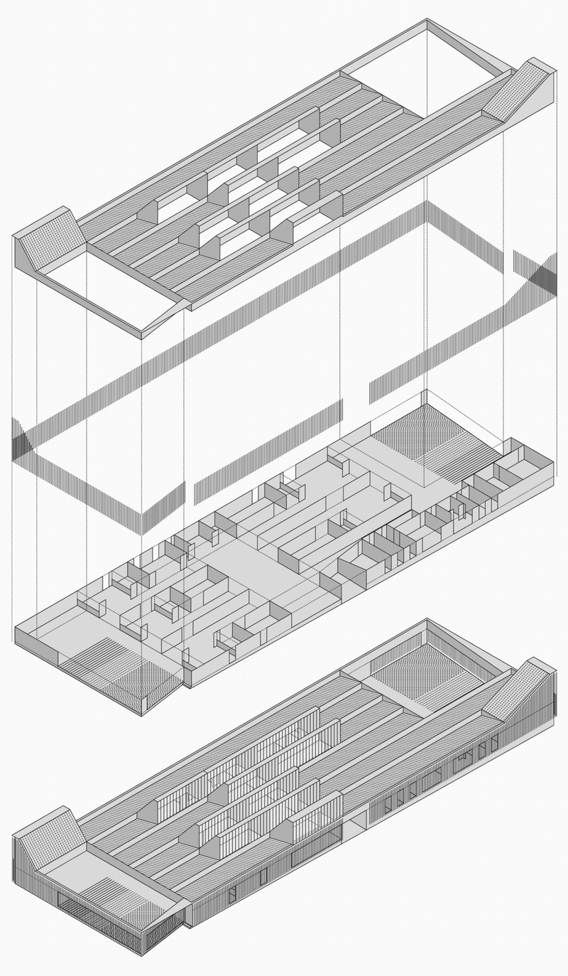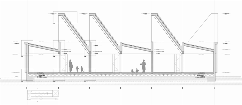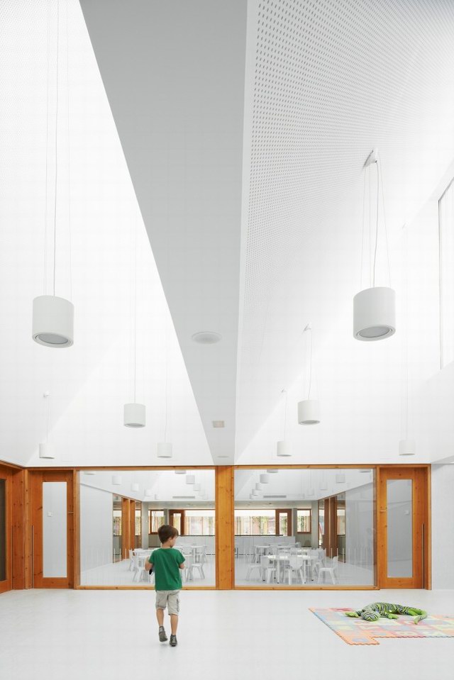 建筑周遭的彩色百叶窗灵感来自于孩子们画画用的蜡笔,能够起到调节教室内光线的功效,同时屏蔽了来自建筑末端操场的噪声与干扰。孩子们就像花朵,当然需要充足的阳光,于是建筑屋顶高高隆起的天窗为室内带来大量光照,同时也增加了建筑的体型变化增添了趣味性。
