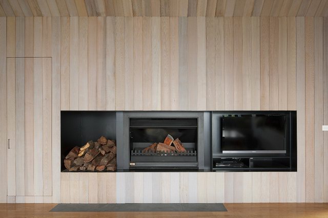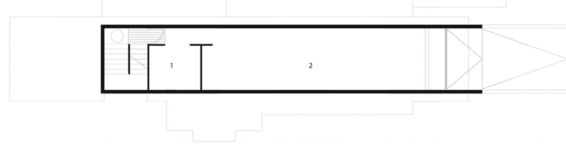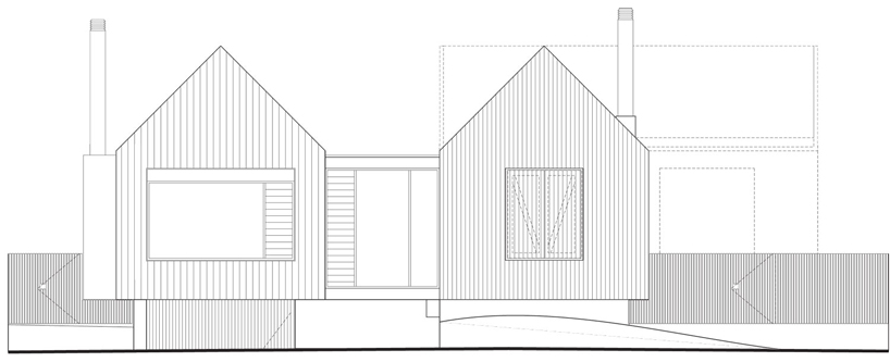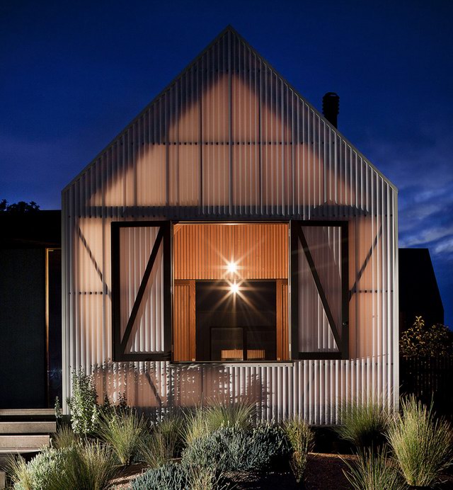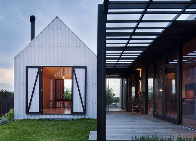 建筑师设计了一座更加持久的、适于居住的建筑来取代原有的小棚屋。在设计上建筑师从当地现存的建筑中找寻灵感,让住宅与周边环境和谐相融,同时还考虑了今后增建和风格改变的可能性。住宅被分成三个相互独立的体量,之间由桥梁连接,北侧庭院阻挡了吹向住宅的盛行风。朝南的住宅被抬升到车库顶端,可以观赏到河面风景,内部包含了各个公共空间——起居室,厨房,书房和客房。西南方向的住宅中则安排了主卧室,套房和休息室等私密空间。穿过户外平台就来到了第三个房间,这里的设计反映了传统乡村小屋的风格,但是外立面却装饰了一层透明波纹板,夜晚将室内的钢梁结构清晰的暴露在外。住宅室内选用了间隔排列的细木条,在保证业主私密性的前提下,创造了室内漫射光环境。半自主的住宅结构为室内引入了自然通风和光照。