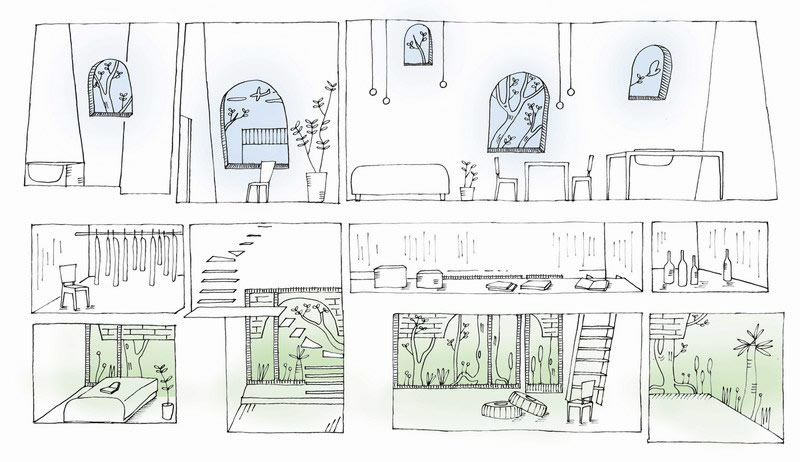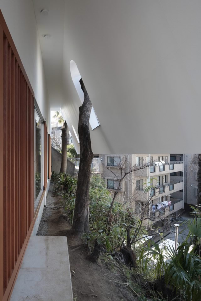 面的窗实为窗洞,这些洞让与其相邻的几颗大树钻到了屋檐里面。建筑与环境间产生了有趣的互动性。