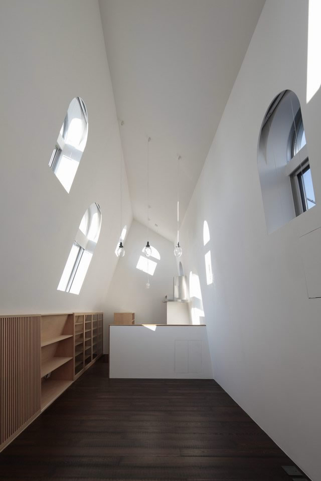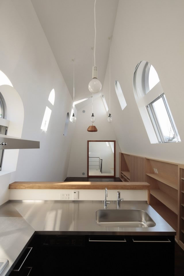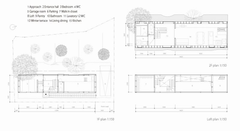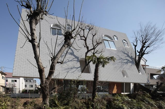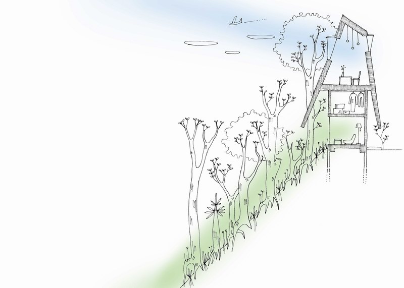 “大屋顶”住宅(House with Eaves and an Attic)总共分为三层,唯一一间卧室位于首层,顶层为起居室和餐厅,中间层为储藏间。大屋顶上开设了大大小小的窗,一部分为三层房间采光,下面的窗实为窗洞,这些洞让与其相邻的几颗大树钻到了屋檐里面。建筑与环境间产生了有趣的互动性。