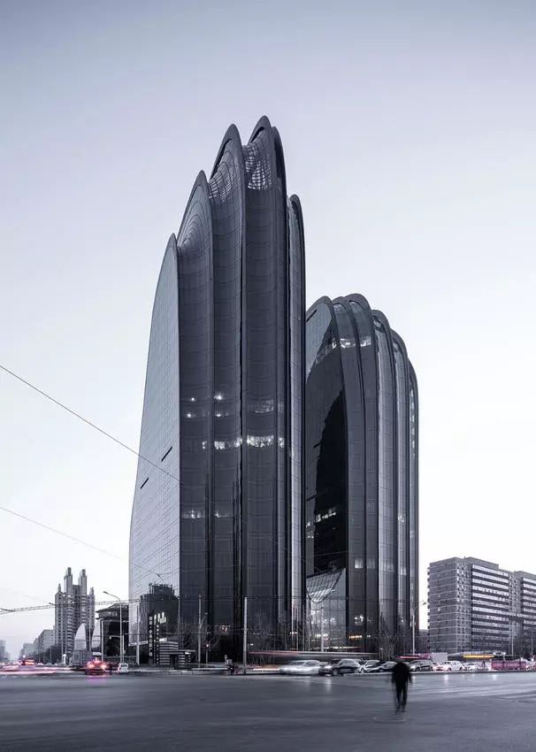 不同于那些强调边界围合感的现代建筑.这组极具未来感的建筑更加强调自然向城市的延伸和渗透.将城市中的人造物“自然化”.运用中国古典园林建筑中“借景”的办法.突破了朝阳公园与城市的界线.使自然和人造景观交相辉映.使人融情于景.