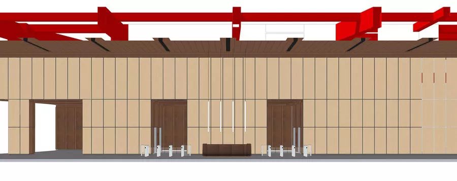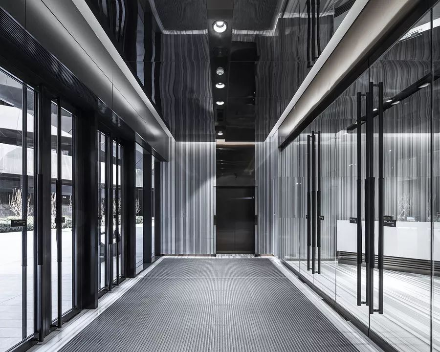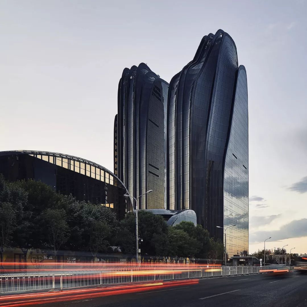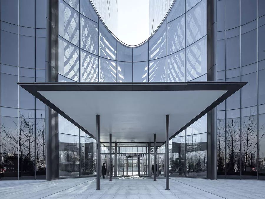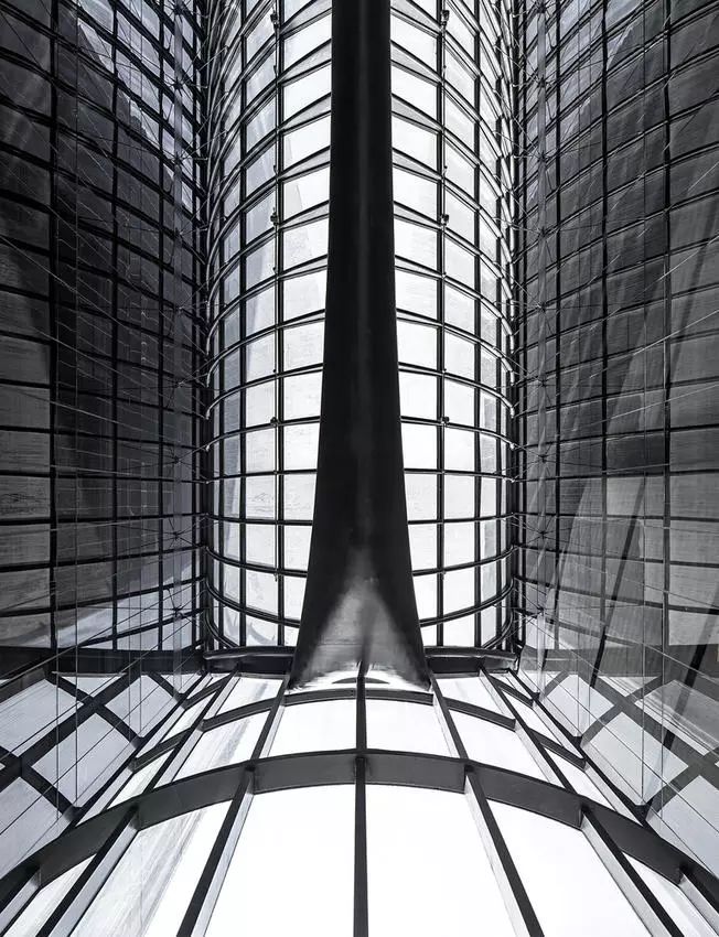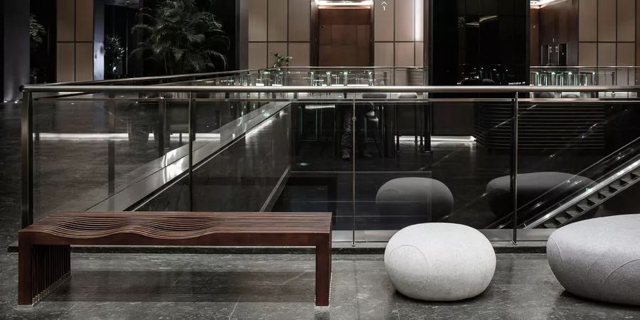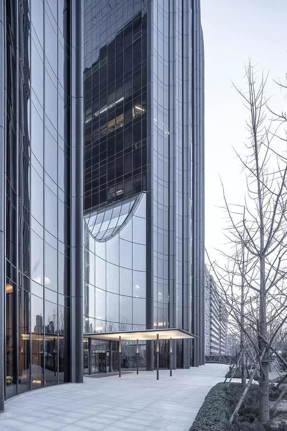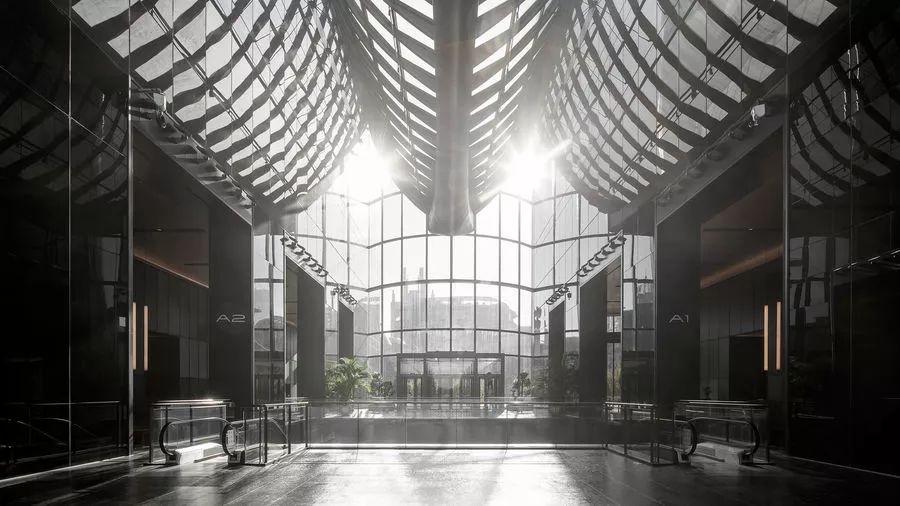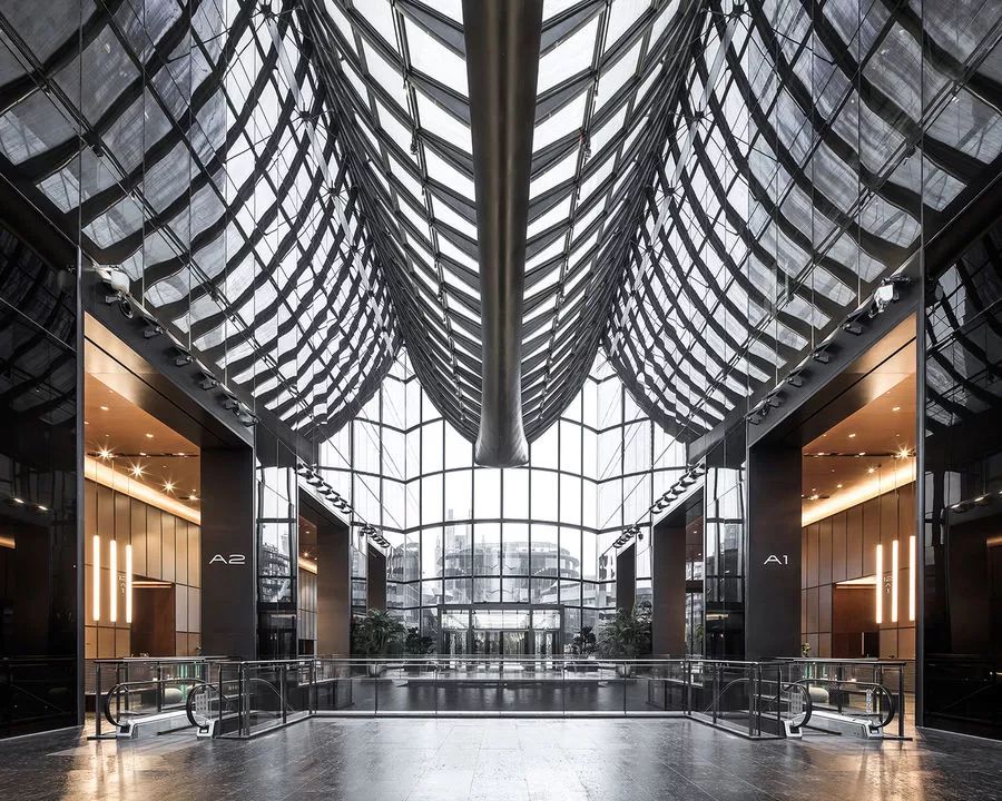 大堂挑空三层,最高处达30米。这是双塔之间的一个巨大连廊,巨型U字构建如垂帘悬在其间成为空间的屋顶,在两侧黑色幕墙的反射后,形成了一片连续的曲面空间,恍若置身于“星球大战”的星际战舰之中。自然人文与科技在此的边界变得模糊,并存在一起;东方自然哲学和高科技的城市空间融合,形成独具特质的现代空间。