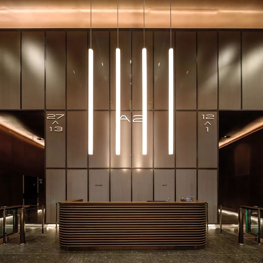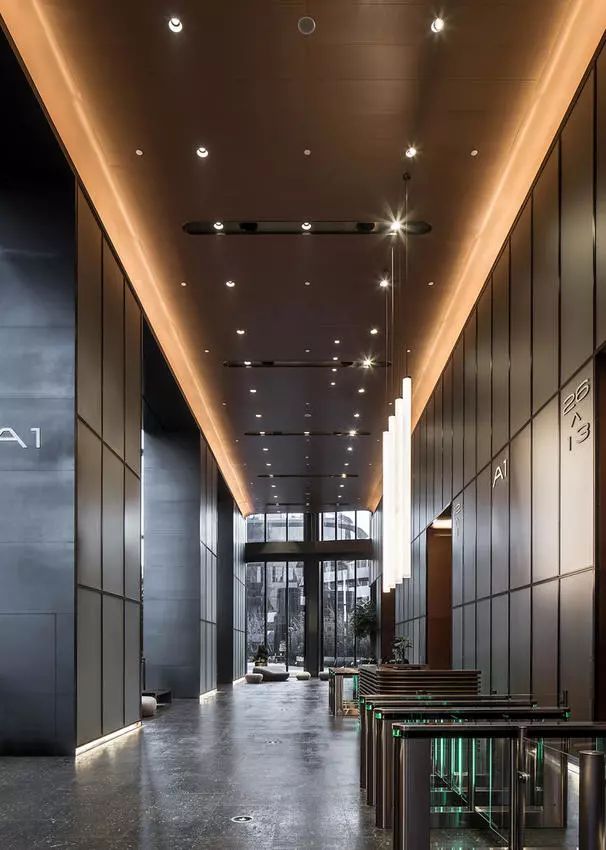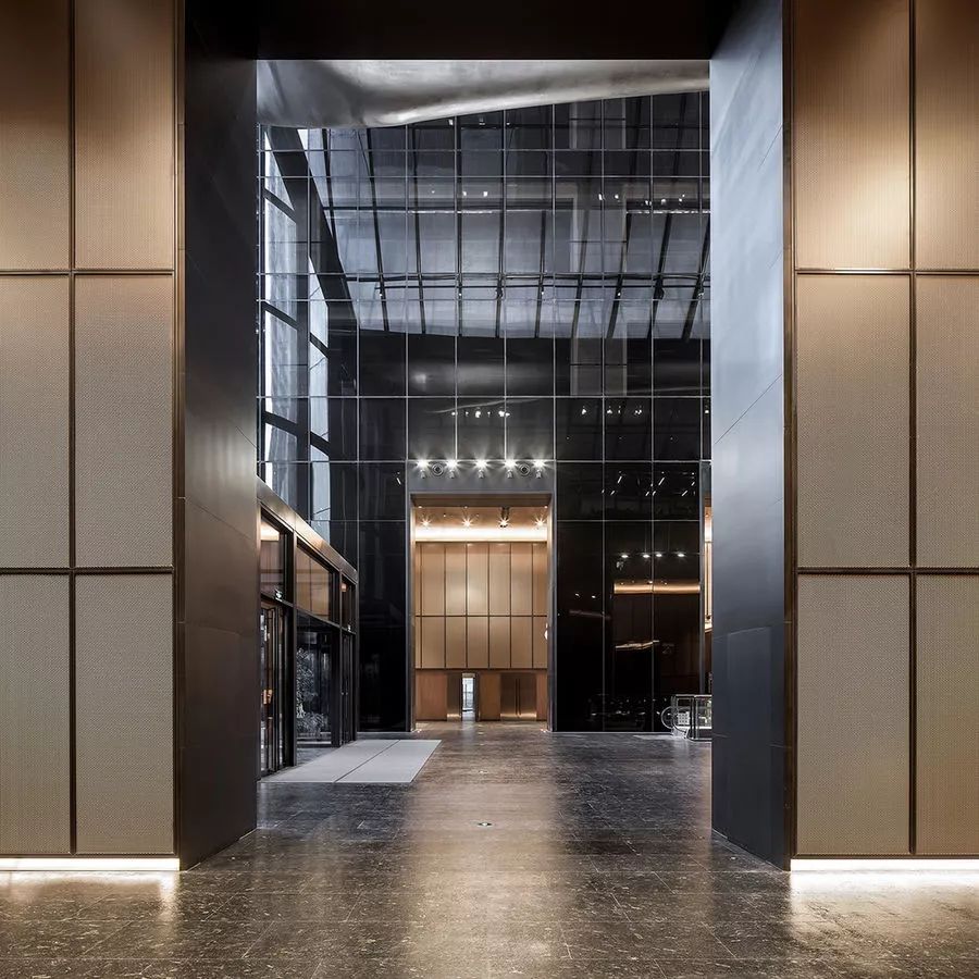 A1及A2主楼形似山峰,一分为二形成双塔。大堂位于双塔之间似飞瀑一落而下。室内设计取“金石为开”之寓意,选用“铜”这种金属为主要材料,使其与黑色建筑幕墙形成色彩的反差,“金”与“黑石”在此形成了内与外的剖切关系,这也成为室内的基本设计观念,延续了“墨色山水”这一设计主题。