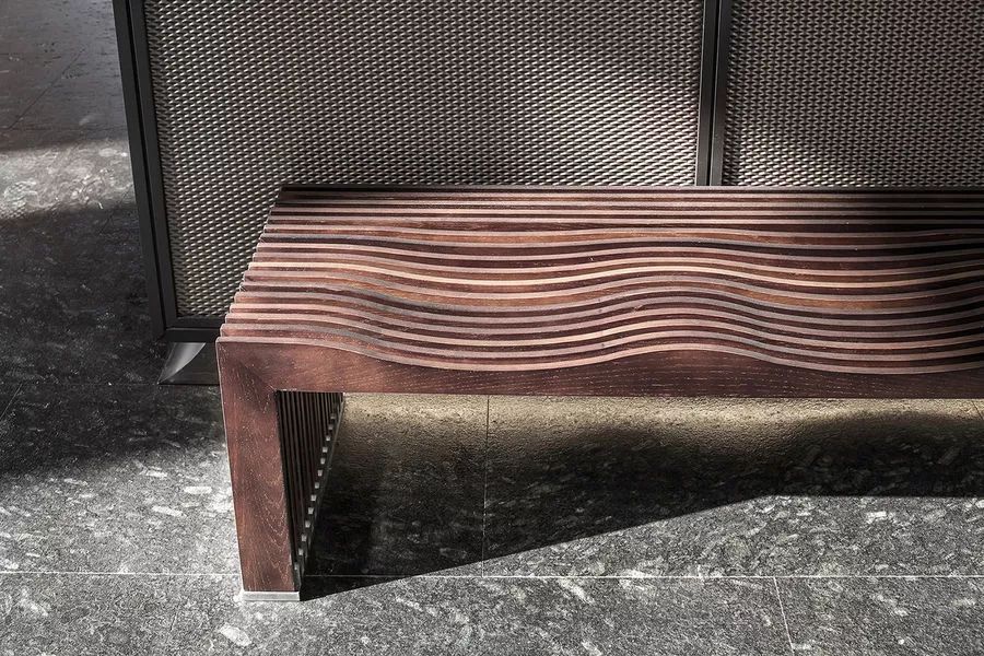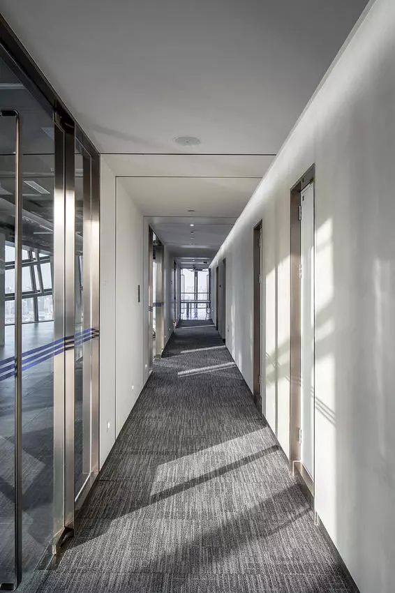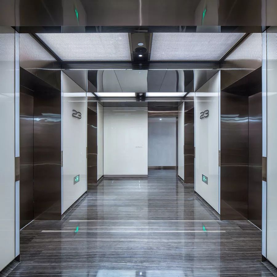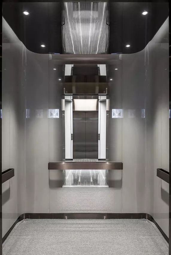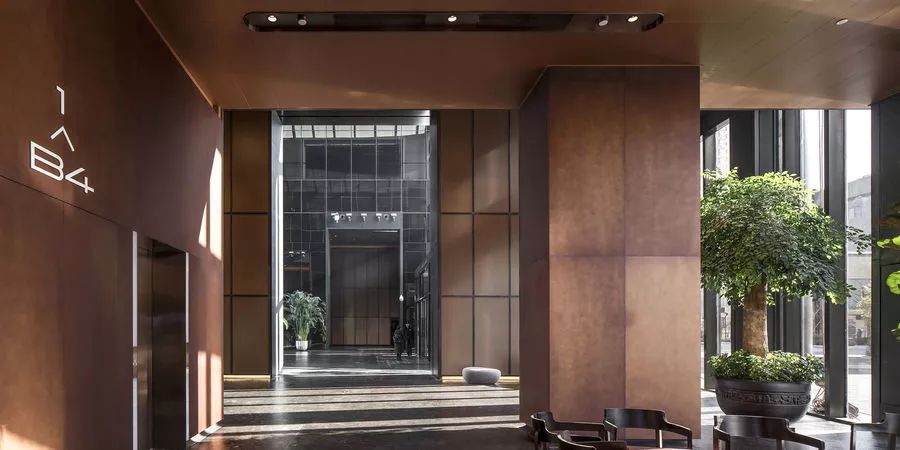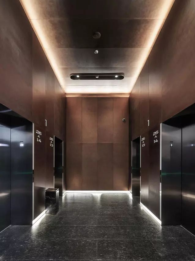 设计中对“铜”的材料做了多种尝试。主走廊墙面采用了鱼鳞状铜质的伸拉网,面层附雾化超白玻璃。雾化玻璃能透出铜网的质感,又能防指纹污染,实际呈现出非常细腻而特别的效果。这个特别材料组合在设计中做了很多次尝试才达到如此效果。电梯厅的墙面及顶面采用了高纯度铜板,铜板在使用过程中会逐渐氧化颜色变深,留下时间的痕迹。
