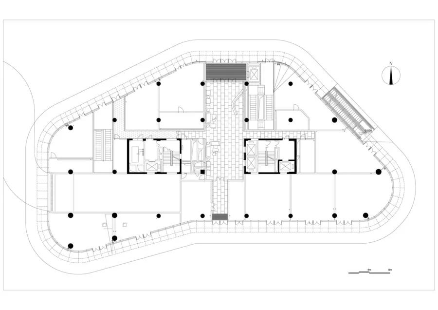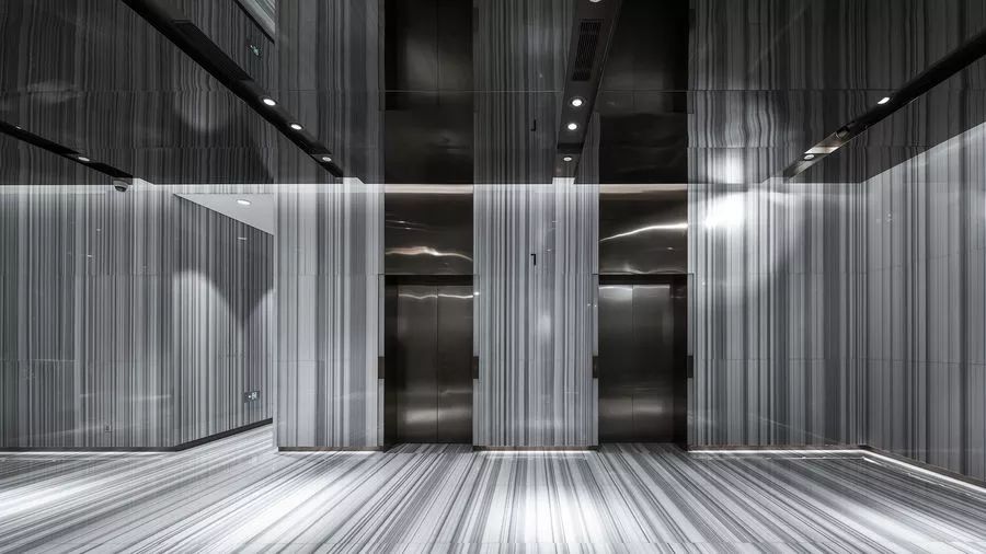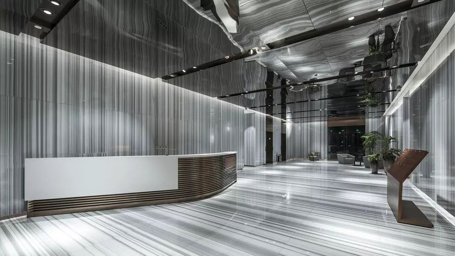 A7号楼是办公群楼中面积最大的一栋,与双塔对望。大堂室内设计定义为“玉石”。运用天然直纹石材使墙与地成为一体,黑白线条纵横连贯,整个空间浑然一体,体现出十足的高科技感。