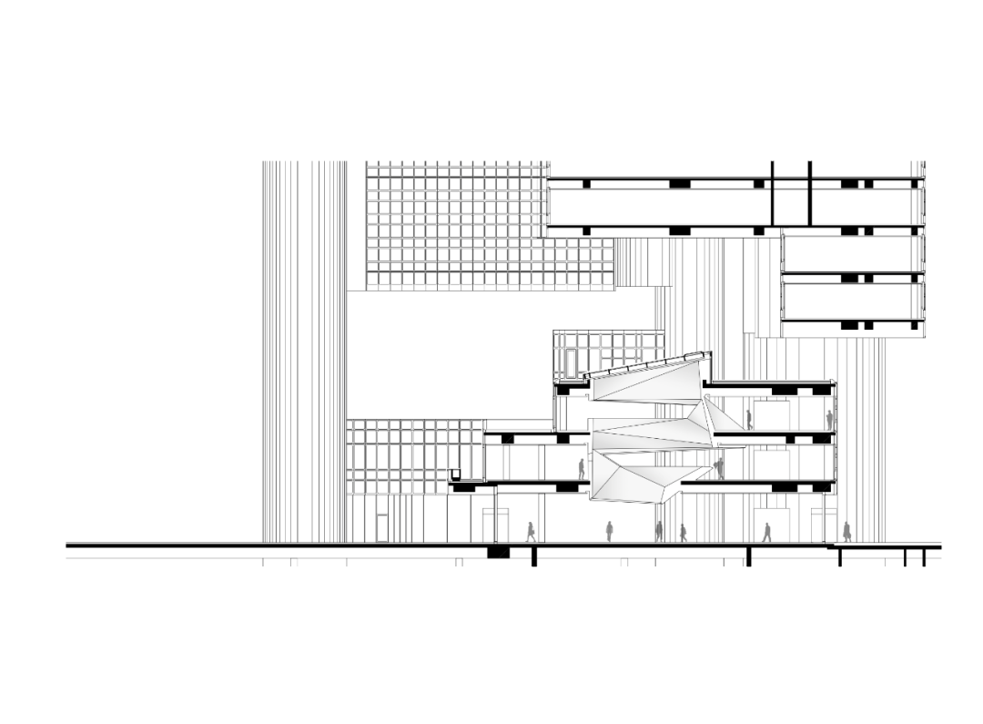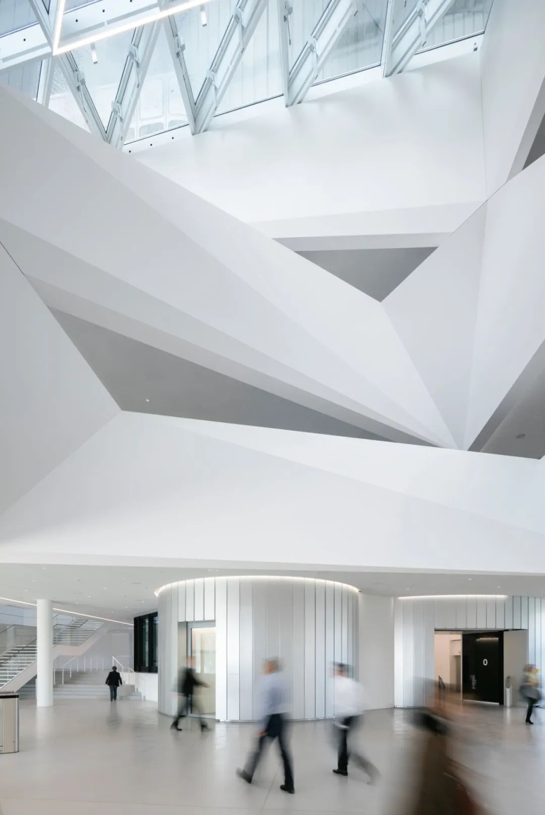 该结构有一个新设计的门厅。三角形的空间被塑造成由展开的多边形表面组成的动态空间,可以从门厅看到上面三层楼的景色。日光透过三角形玻璃单坡屋顶照射到这座水晶雕塑空间的哑光白色固体表面上。