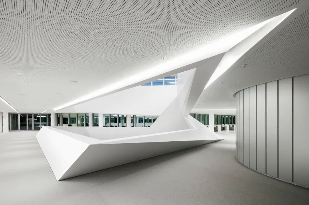 The structure was given a newly designed foyer. The triangular air space, which allows views from the foyer up to the three floors above, was transformed into a dynamic space made from unfolded polygonal surfaces. Daylight streams through the triangular glass mono-pitch roof onto the matte white, solid surfaces of this crystalline spatial sculpture.