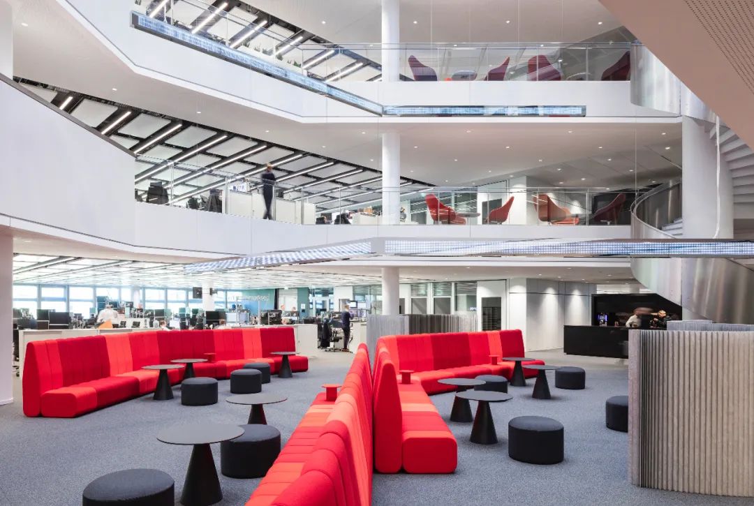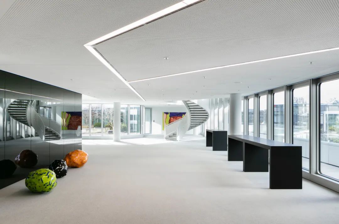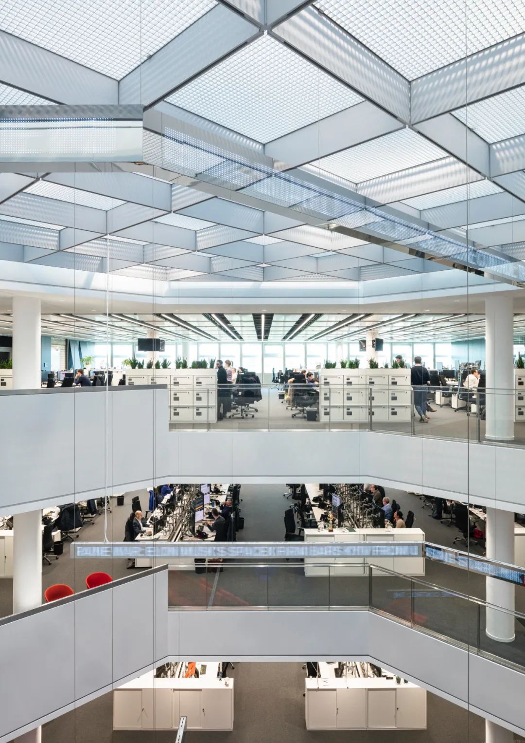 与外立面相比,建筑内部并没有保留原始的状态,在改造过程中进行彻底检修,以适应现代化的工作环境。以前的办公楼层配置被客户开发的智能工作概念所取代,从而将不同的工作和沟通可能性相互结合。