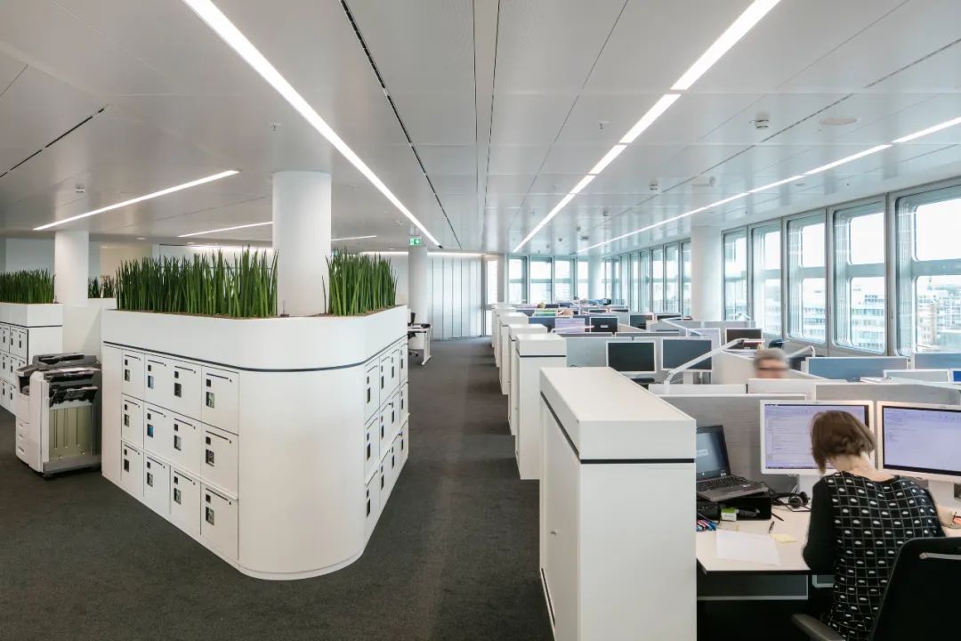 新开发的内壳结构由隔音栏杆面板和带双层玻璃的电动倾斜开口通风口组成。该技术让用户可以通过按下按钮来倾斜和关闭各个内部通风口,从而显着提高工作场所的健康状况。可重复使用的立面元件的穿孔从远处看并不明显,它们可保证新鲜空气的流通。通过绿植技术的翻新,实现了现代化的室内环境理念。