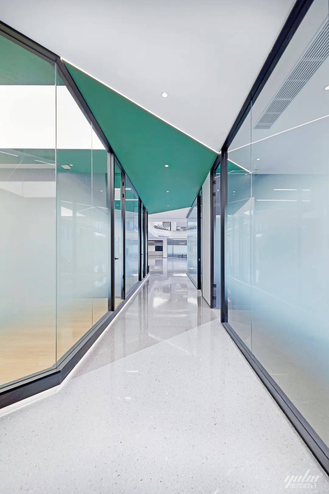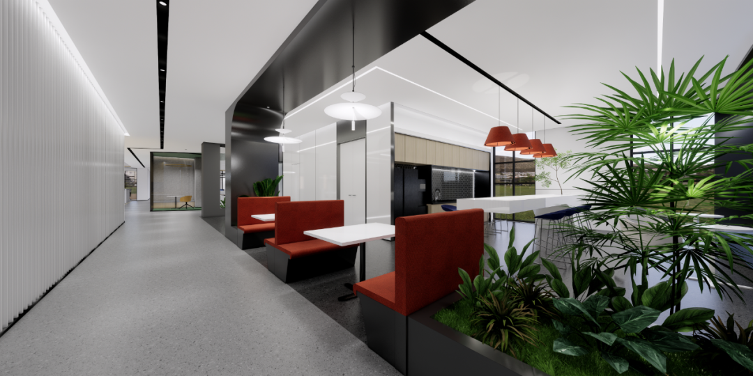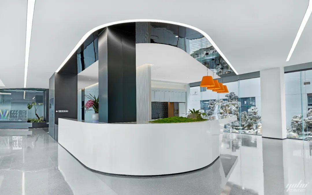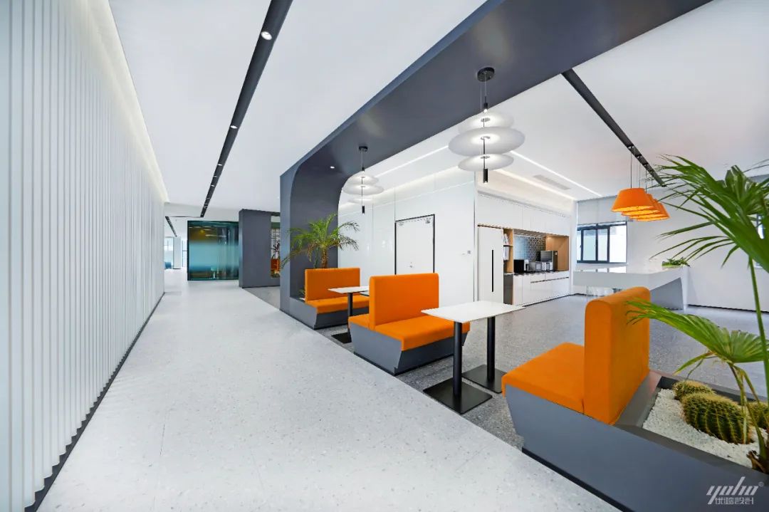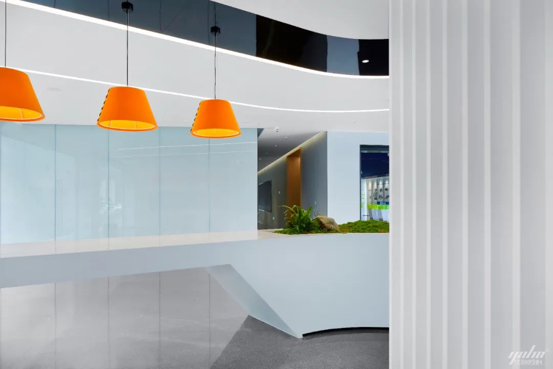 过道的形体运用将空间的结构表达简洁明了,绿色的穿插呼应了制造生产企业的文化气质。天花体块与过道的链接,形成视觉的整体感和艺术延伸效果。