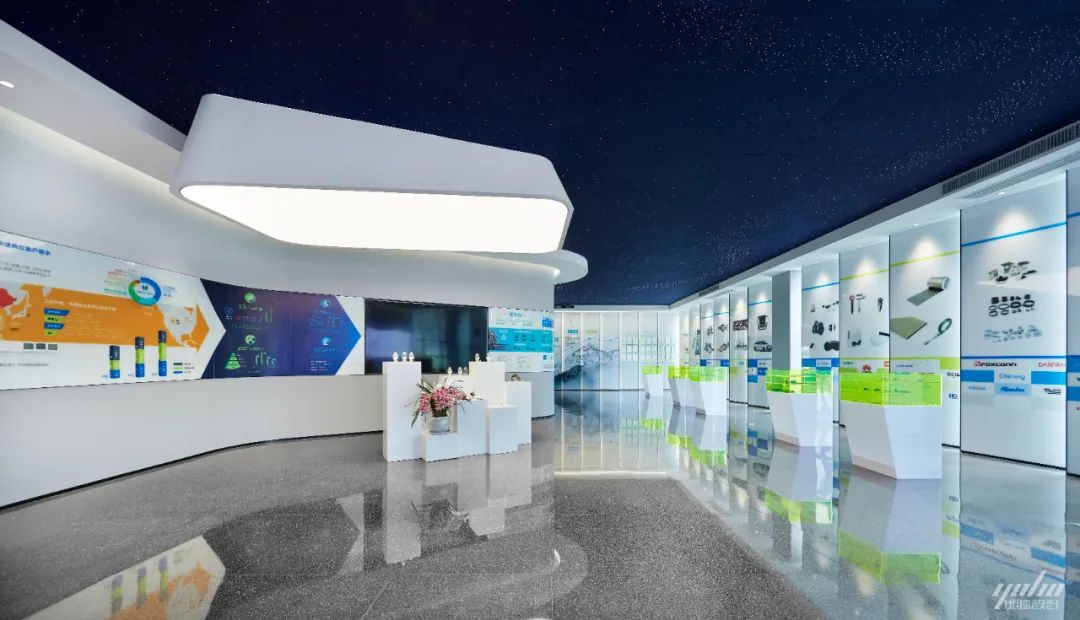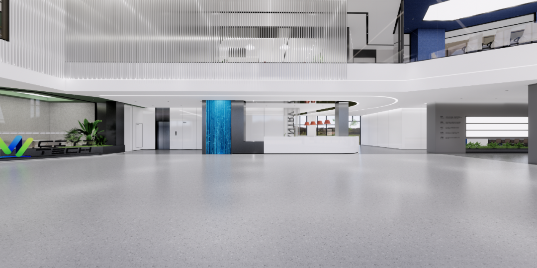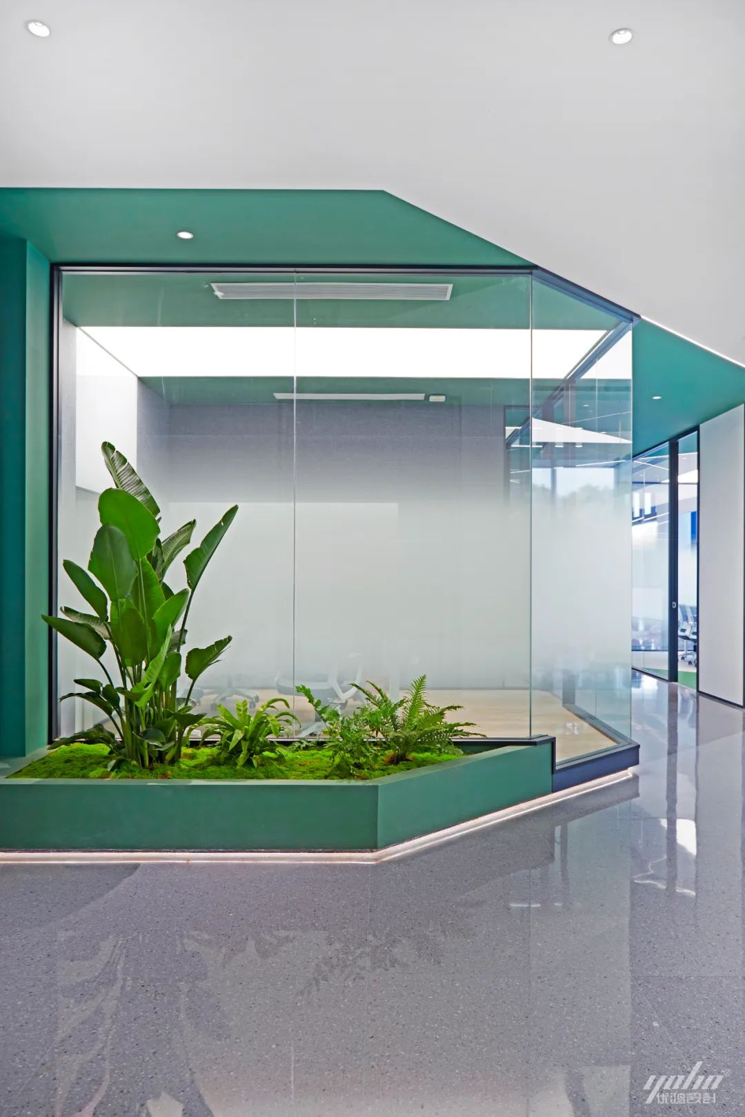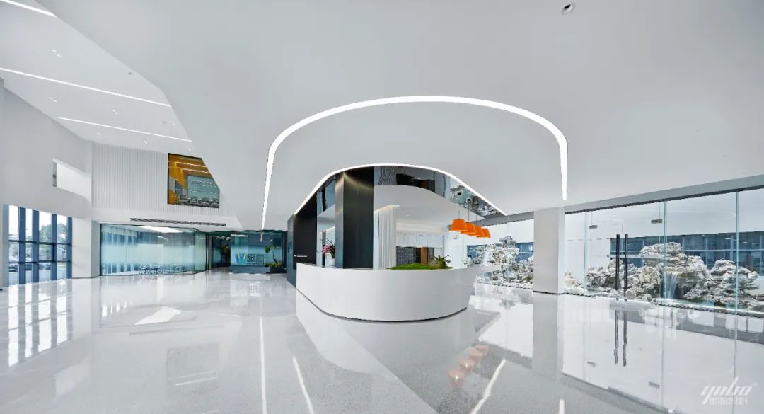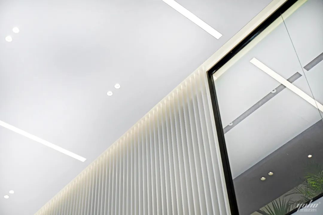 过道的形体运用将空间的结构表达简洁明了,绿色的穿插呼应了制造生产企业的文化气质。天花体块与过道的链接,形成视觉的整体感和艺术延伸效果。