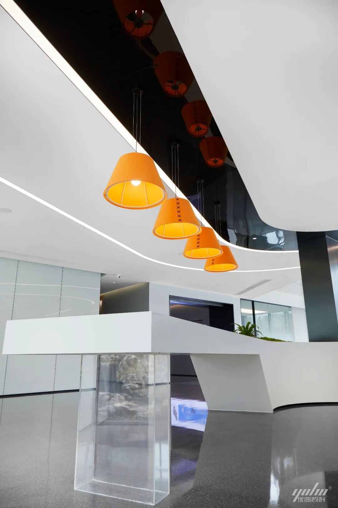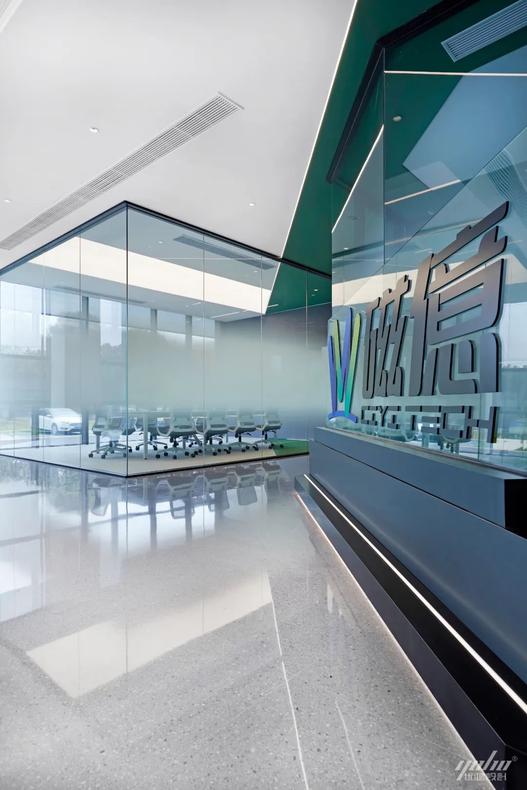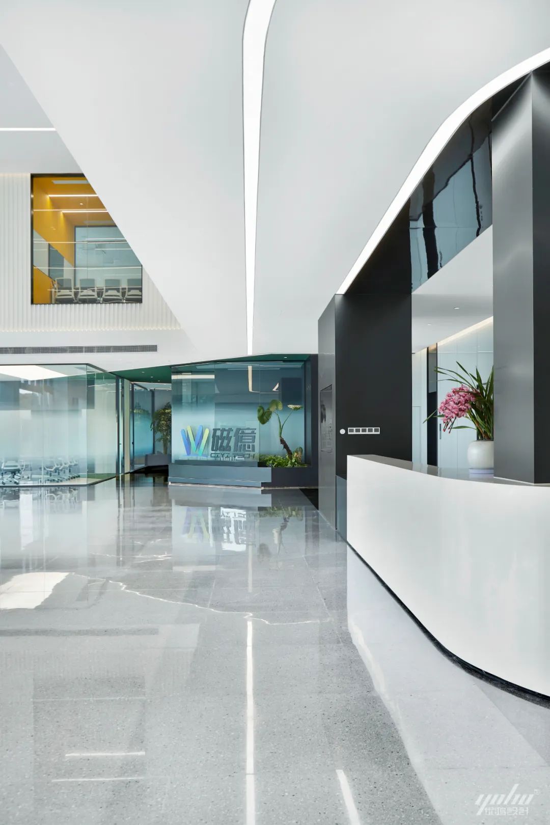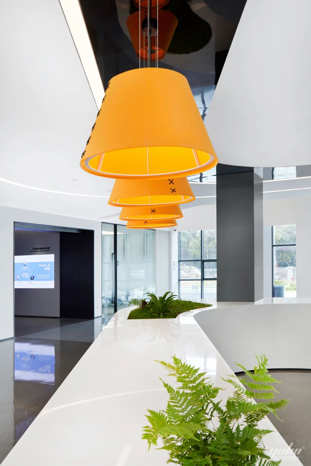 过道的形体运用将空间的结构表达简洁明了,绿色的穿插呼应了制造生产企业的文化气质。天花体块与过道的链接,形成视觉的整体感和艺术延伸效果。