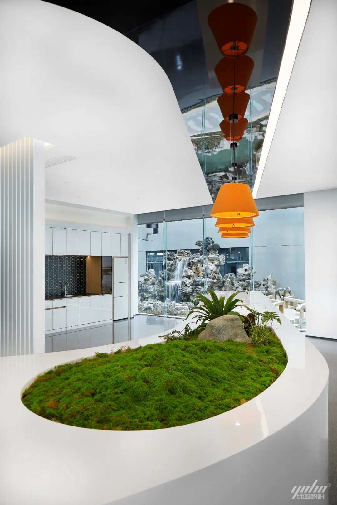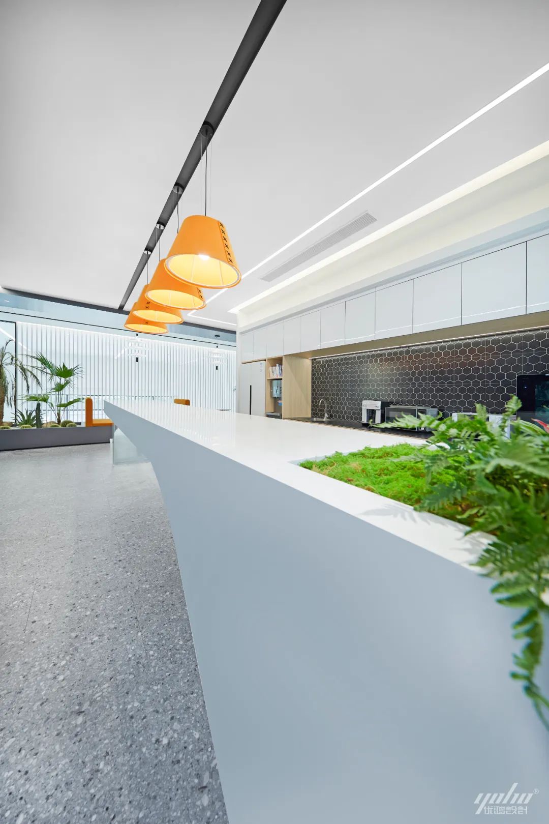 行至此,视觉焦点被几抹靓丽的色彩逐渐吸引,清新跳脱的吊灯与空间形成错动的韵律,台面上精心养护的植物盛放极强的生命力,将绿色生态映衬得生机盎然。