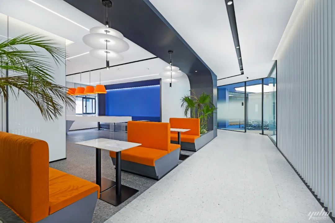布局合理、错落有致的空间分布,让人可以在工作和短暂休息间灵活切换。吧台设计、几何构成感的顶面造型,为办公空间带来了独特的艺术化表达。