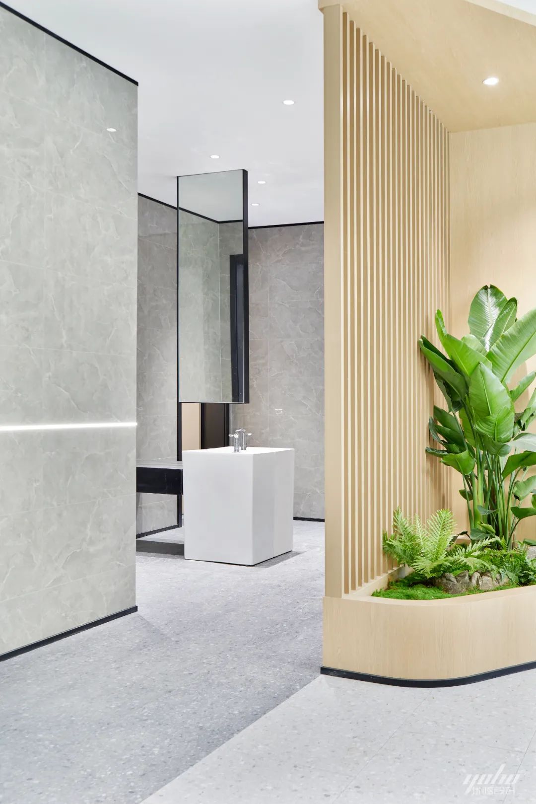 前厅作为空间的交通枢纽, 同时也是进入空间中印象的存在,设计师更多考虑的是其代表的形式感,以一种较为现代且充满建筑体量的形式自然出现。