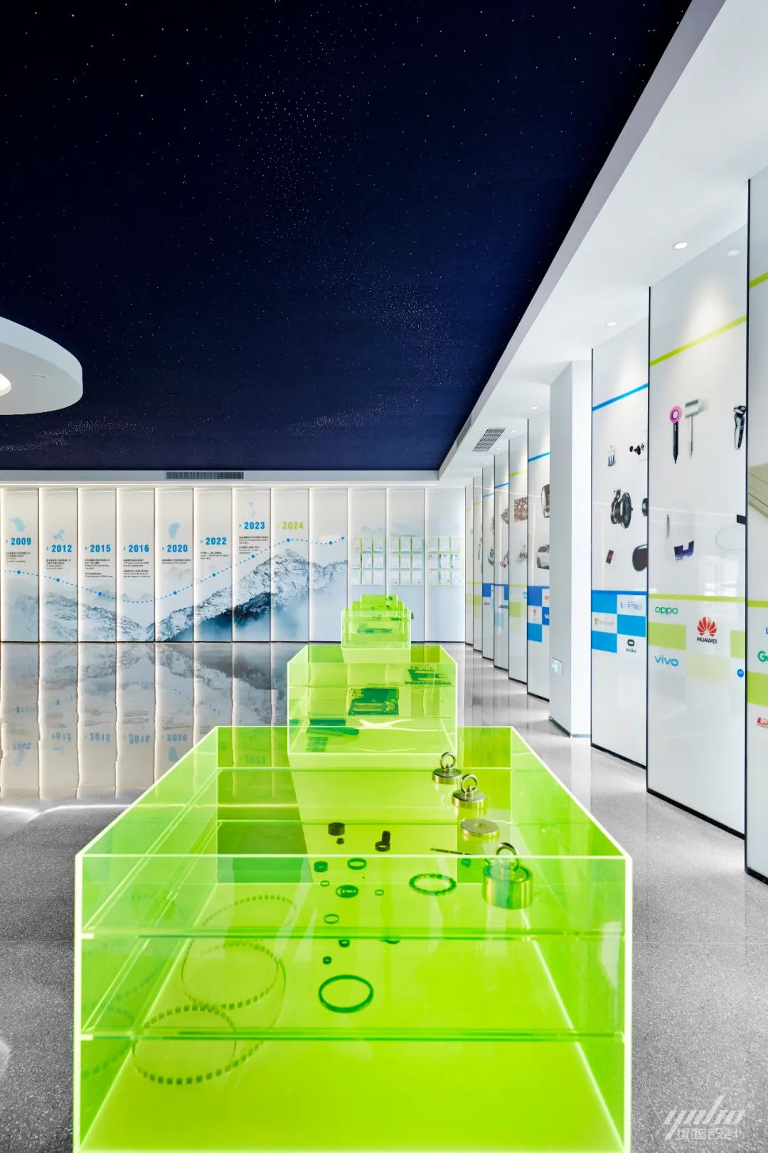 星空顶复刻出璀璨银河的模样,最大化的给人强烈的视听感受,浩大而庄重。以这种震撼的方式将磁亿的先进技术与企业愿景亮相大众。