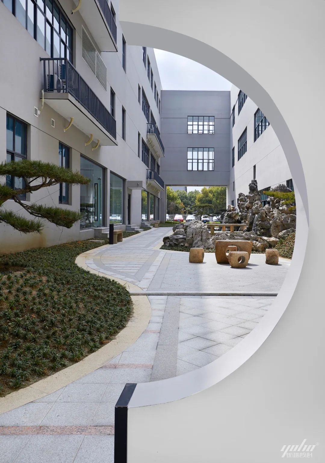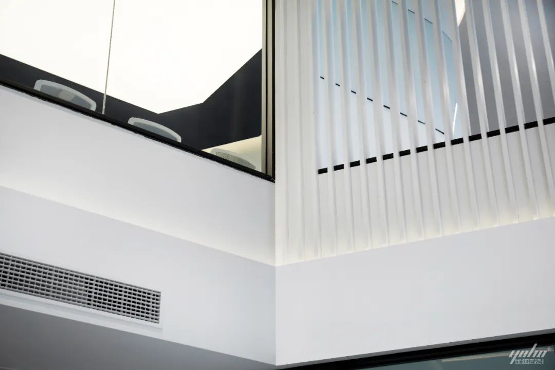 △ 立面简约大气的外立面造型以及不同材质的搭配,刻画出企业庄重包容的姿态。巨大的屋檐出挑保持外立面的简约大气,以开放的态度迎接每一位来者。