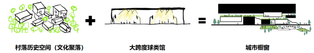 在建筑设计层面,我们提出“城市橱窗”的设计理念,一方面依托于对在地文脉的思考,希望在中轴上还原片区周边历史村落特质,呼应光明的历史空间气息;另一方面我们希望创造一个新的文体空间类型,即低区以村落形式组成内外街巷,高区形成完整弹性的大跨度综合球馆,建筑聚合个体空间及群体空间的空间交织,展现空间上的多样性尺度,营造空间趣味性与丰富性。