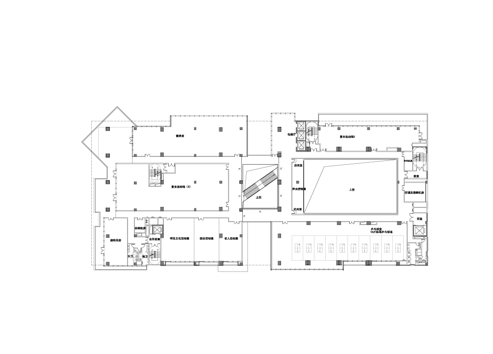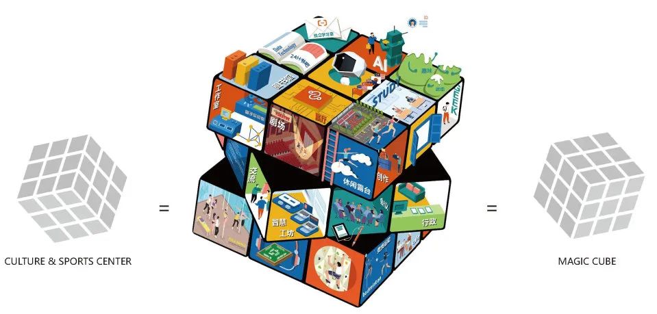 针对室内空间设计,结合丰富的功能空间与橱窗的设计概念,我们提出“文体魔方”的空间设计理念,将不同属性,不同人群的空间,装载进一个方盒子里,形成奇妙的化学反应。