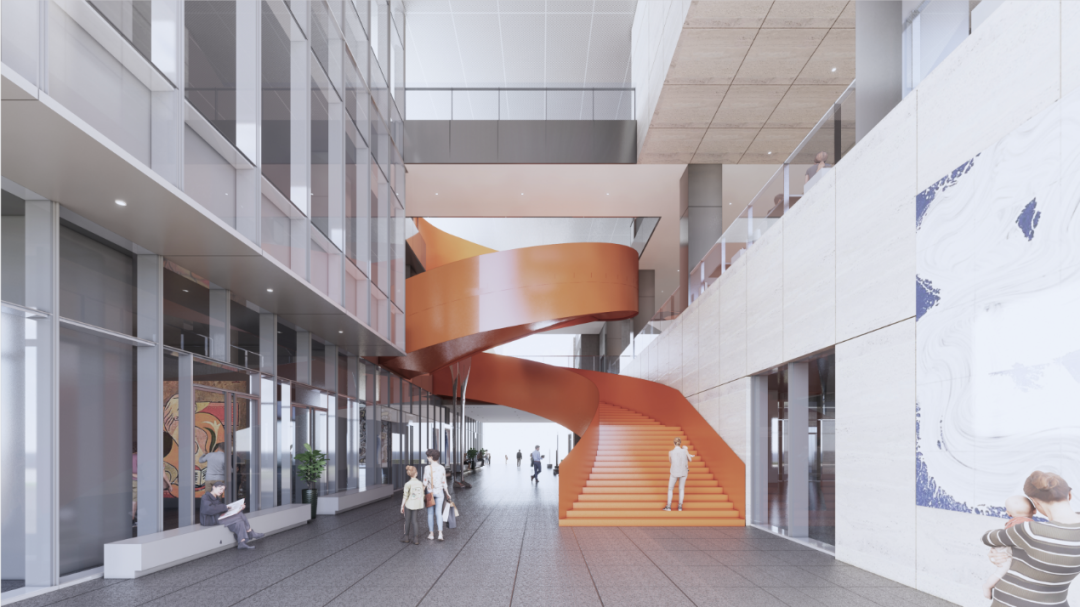 首层结合城市设计理念,创造一个T字形通廊空间,有效导入人流,形成开放的街区,同时结合片区的“活力橙”色系,在建筑的核心位置置入一个螺旋楼梯艺术装置,营造建筑的IP空间。