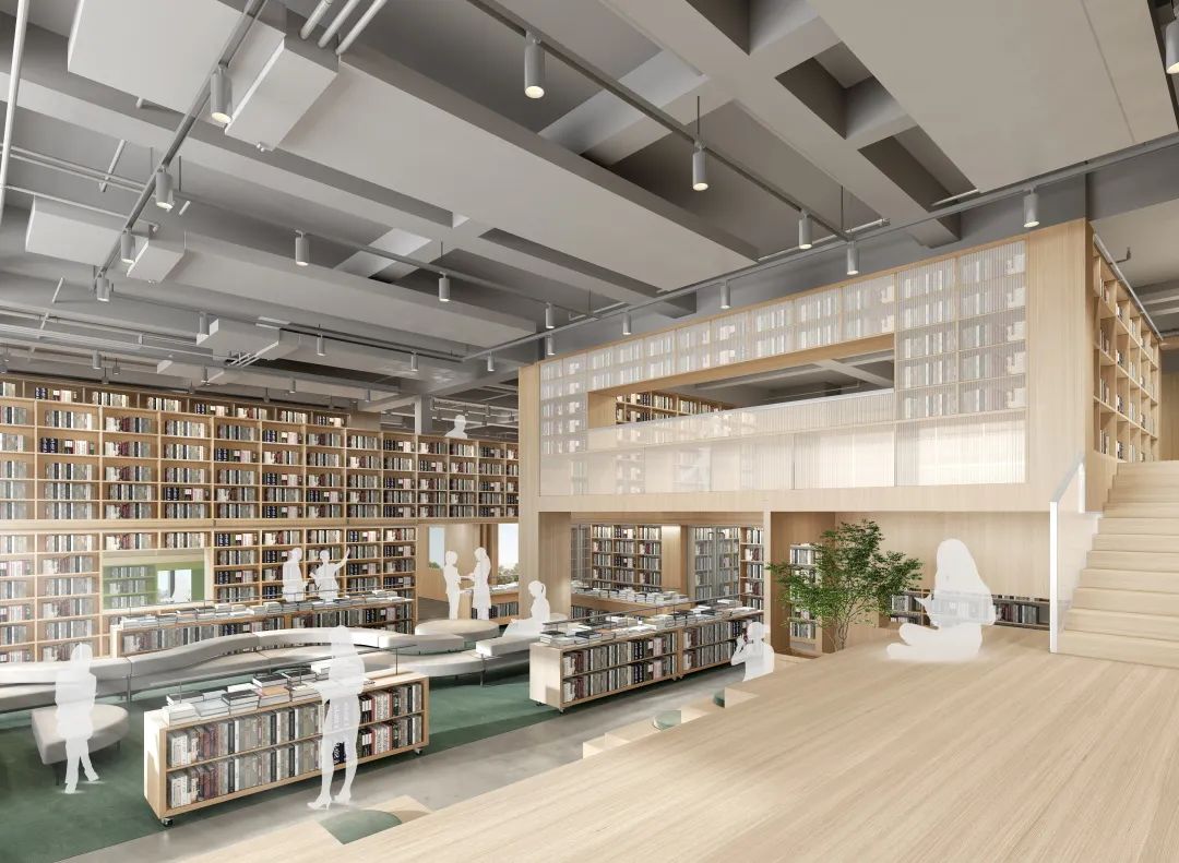 二层的图书馆作为整体建筑中最核心的功能之一,也是本次设计的重中之重,我们希望在这里创造一个关于书的装置,从中式园林里提取设计元素,结合两层空间特性,营造一个可行,可望,可游,可居的集丰富性与功能性于一体的“书苑”。