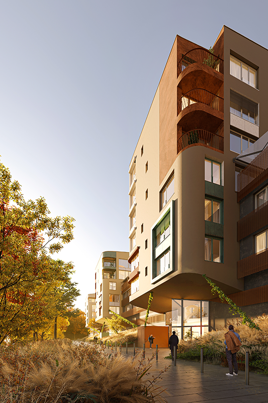 There is currently not much greenery on the former industrial site. The project therefore aims to bring the residential complex ‘closer to nature’. Green roofs with extensive or intensive greenery are planned on the lower parts of the buildings. Climbing plants will also be used on the façades. In addition, richly planted communal gardens will be created in the inner blocks, which will be irrigated using rainwater collected in four newly built retention basins.