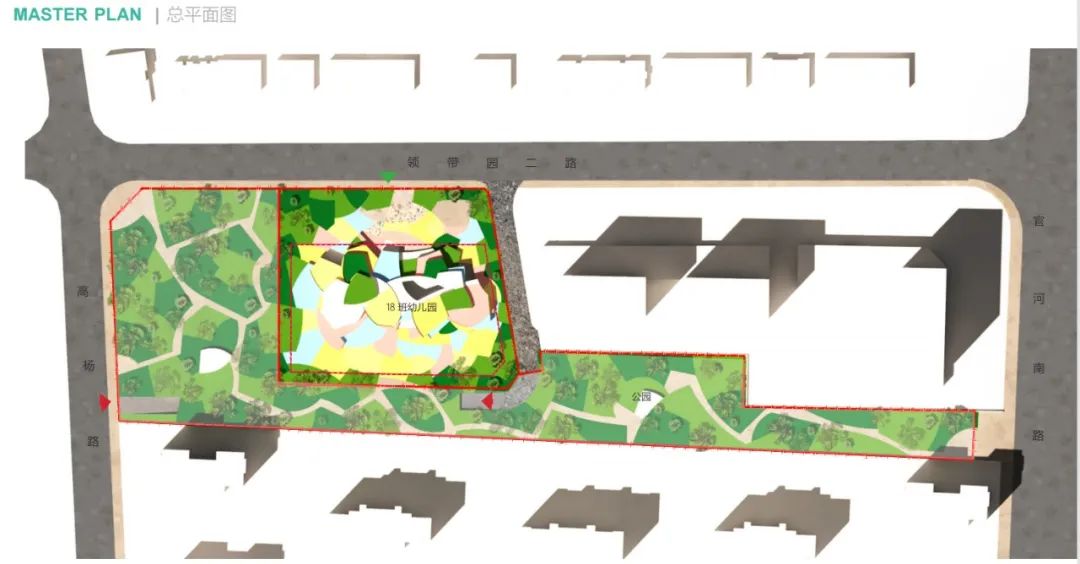 基地位于高杨路与领带园二路交叉口的东南角,包含R22幼儿园地块(约7500m2)和G1公园地块(约14000m2)。根据地块形状及周边条件,需集中设置负一层地下停车库跨越两个地块。所以,整体的设计包含了一个18班的幼儿园和一个社区公园,两个项目捆绑在一起,同步设计,同时施工。