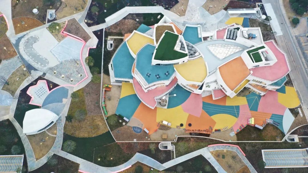由于设计范围的扩大,我们提取了森林城堡的设计理念。森林是对公园的回应,城堡是幼儿园建筑的意向,两者融为一体,相辅相成。站在上帝视角,采用了抽象的几何图案来统一场地景观与建筑。图案的不规则性和随机感,是对自然的一种有机诠释。