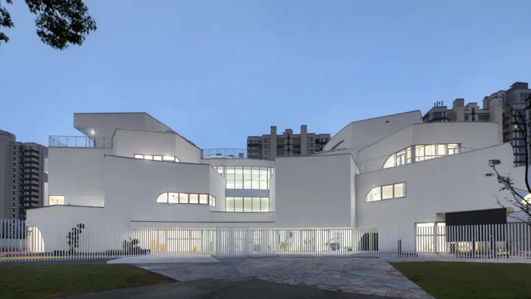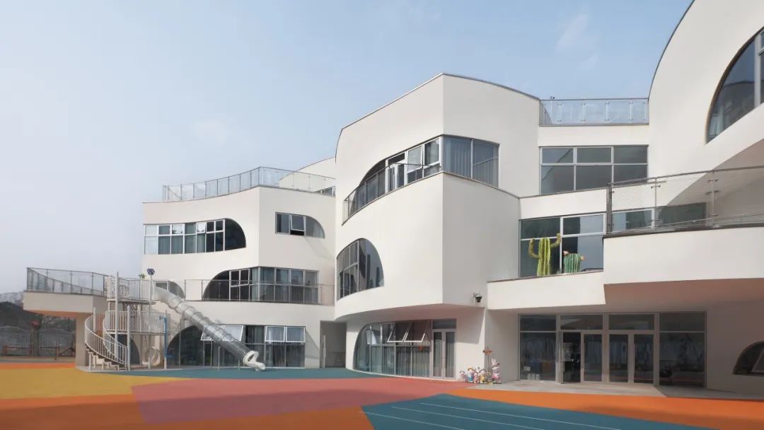 形体的有机退台,给予小朋友们更大的室外活动空间,形成立体的户外活动场景。北立面是幼儿园入口的正立面,形体的退台及弧形墙面组合,在光影下变幻出生动景象,成为城市界面的一道风景。