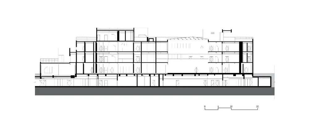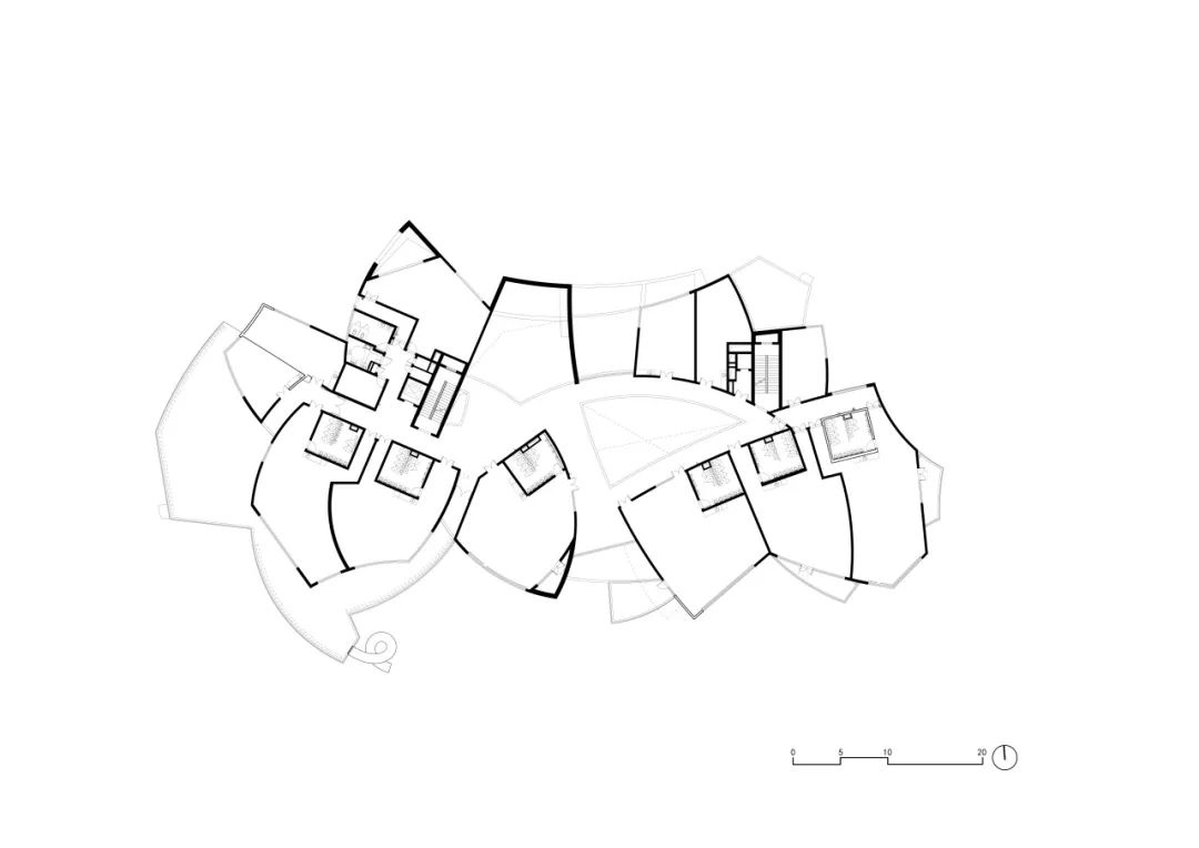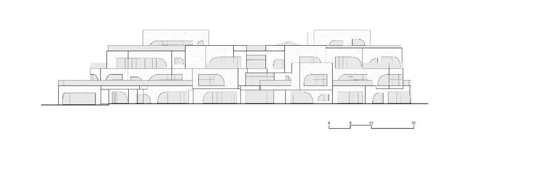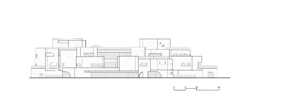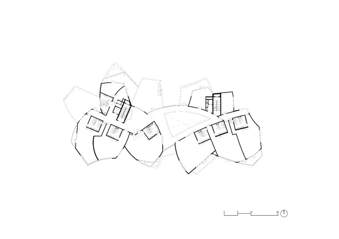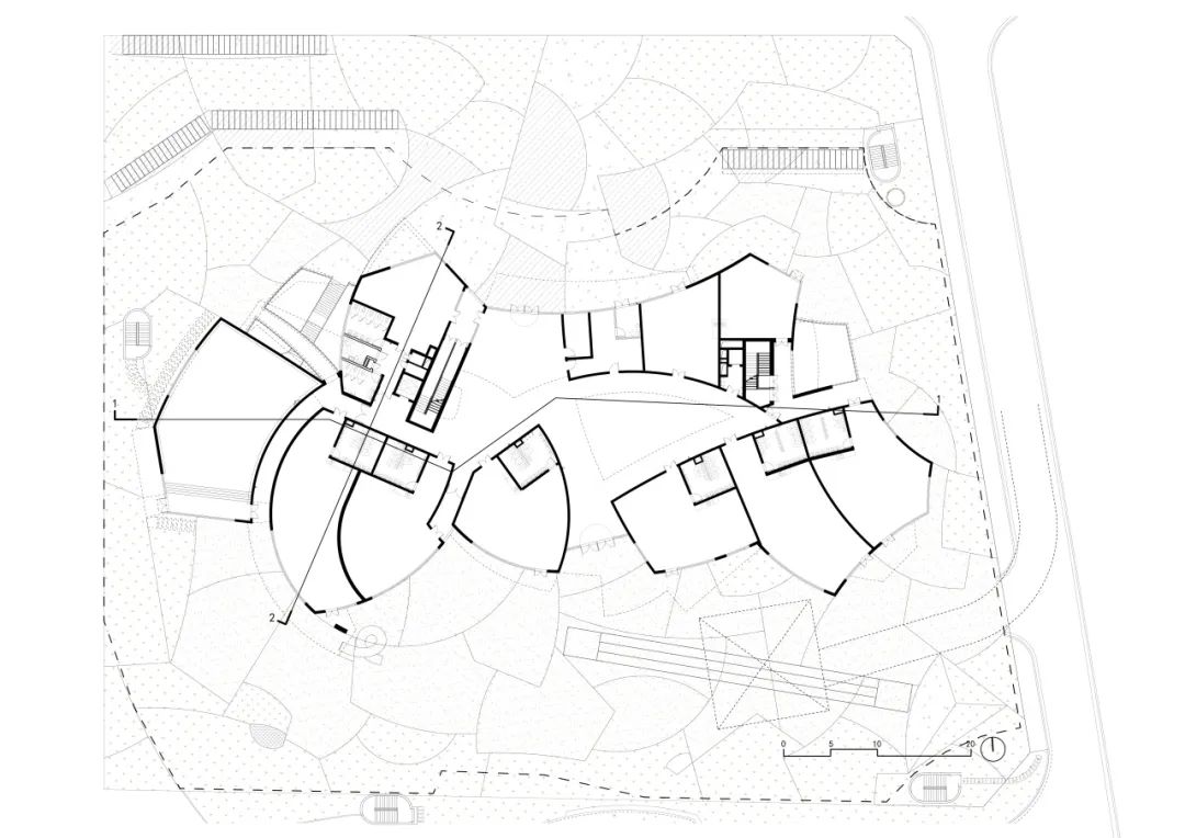 利用几何图案在竖向上的生长,延伸出地面的建筑和下沉的广场。建筑形体在空间环境中,也会继续延伸与发展,仿佛树木的生长,依据环境,延伸出呼应的造型。具体地说,建筑的设计发展,是根据周边环境及自身功能需求,在结构及设备可行的框架内进行,其核心是自然感及平衡感。由于建筑形体的丰富和有机,立面采用纯净的白色,体量显得轻盈,犹如一舟子。