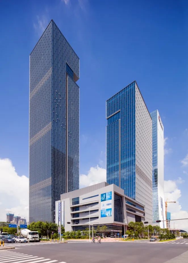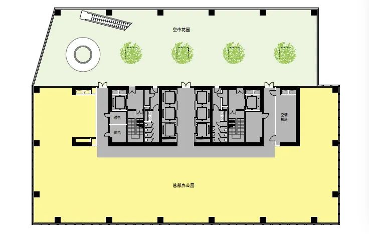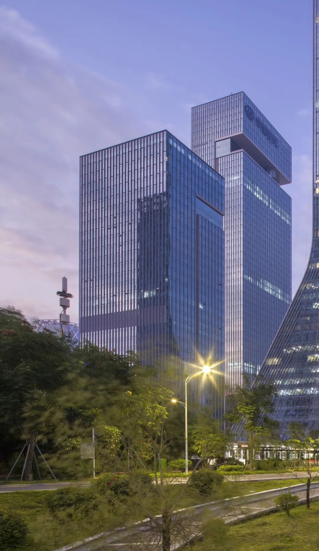 南山区深圳湾景观资源丰富,项目东侧有广阔深远的城市视野,为了在200米的高空设置一个具有独特体验的公共空间,本案创造性的设计了一个单侧无柱、270度视野的超级观景平台。结构采用了屋顶桁架下部悬挂的特殊结构形式不仅实现了无柱空间的效果,也兼顾了室内及室外两种空间需求。同时在顶部设置了连续的内中庭空间,纵向贯通的办公空间中庭与花园结合,为总部办公楼层建立丰富的内部空间联系。