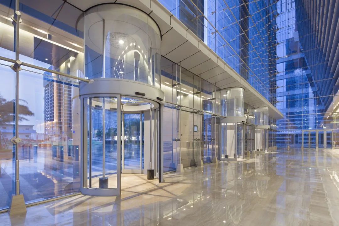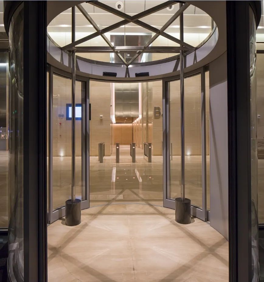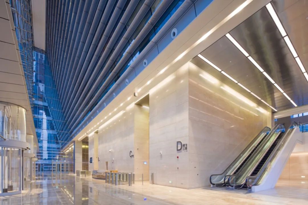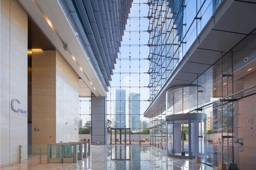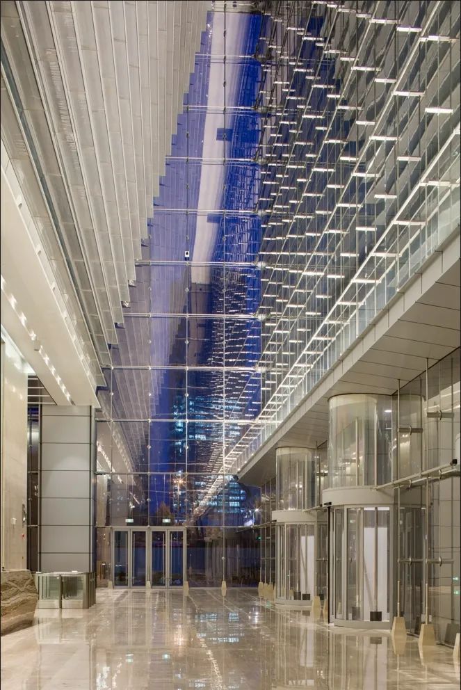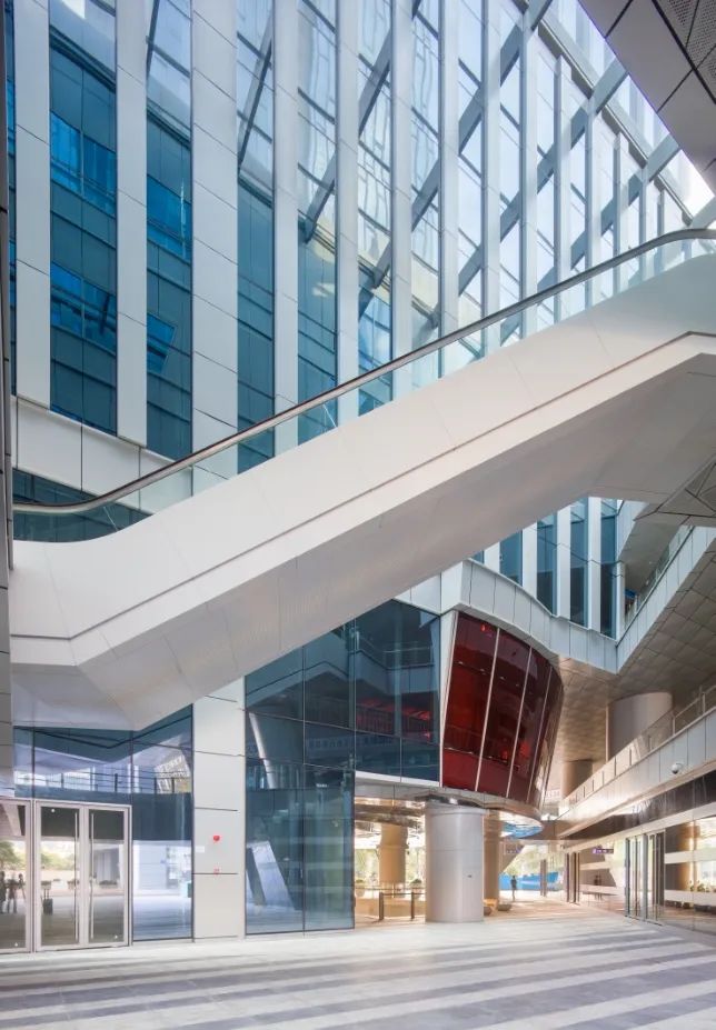 为了与广场形成空间和视线上的融合,办公塔楼设计了高达30米的大堂,三面悬索幕墙提供了绝佳的观景界面。为强化视觉通透感,将两个角柱与第二跨柱合并成V字型,极大的扩展了横向视野。设计采用了双索幕墙系统,纤细精巧的索网形成了通透的内外视觉联系,飞展的雨棚和三个圆柱形的玻璃门斗,为使用者带来航天科技的想象。